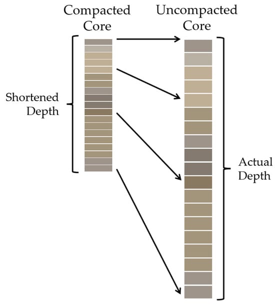 Depth comparison between a compacted and uncompacted sediment core sample. Cores collected from open-barrel samplers are prone to core shortening and require depth correction to represent the correct layer placement of undisturbed sediment.