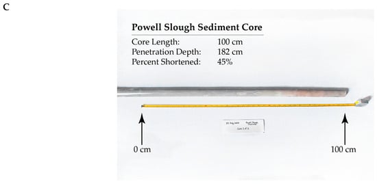 The target depth for each of our core samples was 2.4 m (8 feet) beneath the sediment surface. While our equipment had a total reach of 6.7 m (22 feet), much of this length was needed to extend the equipment through the water column and into the lake sediment. The Utah Lake watershed experienced an exceptionally good water year at the time of this study, causing the lake to be particularly full during field sampling in the summer of 2024. We were consequently limited to sampling in near-shore areas along the lake’s perimeter, as the offshore portions of the lake were too deep to be accessible for our equipment. A few of the previous Utah Lake paleolimnological studies [,,,,], were conducted during typical water years when the lake level was lower and collected core samples toward the center of the lake. By limiting our collection sites to near-shore areas, we acquired a unique dataset that complements the data collected by previous studies.
