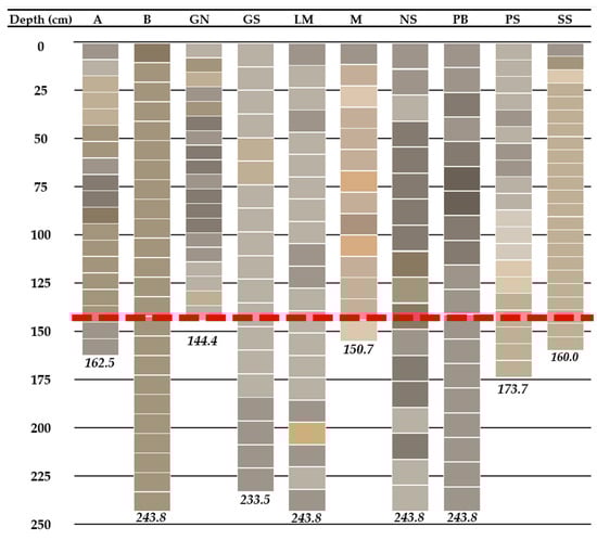 Figure 5 presents a comparison of core depths and colors, with subsamples shown as individual rectangles bounded by white lines within each core. In Figure 5 the core depths have been corrected for core shortening, resulting in unequal intervals between subsamples (see Section 1.4). The subsample colors are the actual colors observed using Munsell color matching charts [] and were generally classified as gray or brown, with hues in the 2.5Y and 10YR categories, lightness values between 4 and 8, and chroma values between 1 and 3. The red dashed line indicates the depth of the shortest core sample (rounded to 140 cm), which was used as the comparison limit for sediment core data across all samples above this depth.