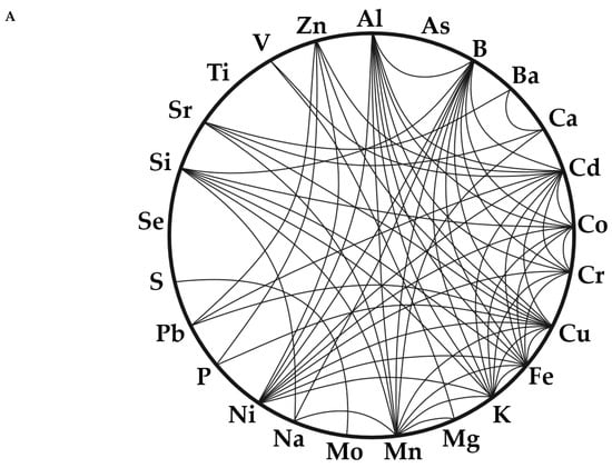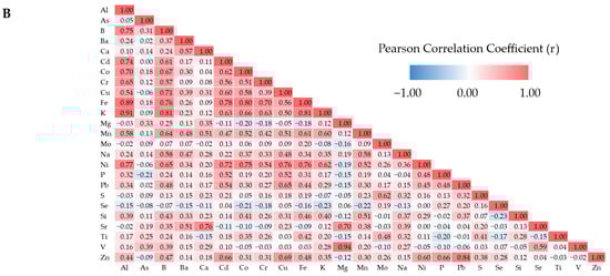 Pearson correlations between ICP-detectible elements from all 10 sediment cores down to a depth of 140 cm. The chord diagram (A) shows strong positive correlations (r > 0.5) as connecting lines between elements. The correlation matrix heatmap (B) displays all pairwise correlations, regardless of strength.