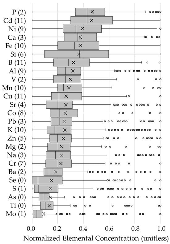 When the normalized distribution of these elements is plotted (Figure 7), all concentrations fall within the range of 0 to 1. Elements with distributions centered around 0.5 are closer to a normal distribution, while those near the extremes are more skewed. Because all the median values (represented by the vertical line in the box) are less than 0.5, all the data are right skewed, with some being more skewed than others.