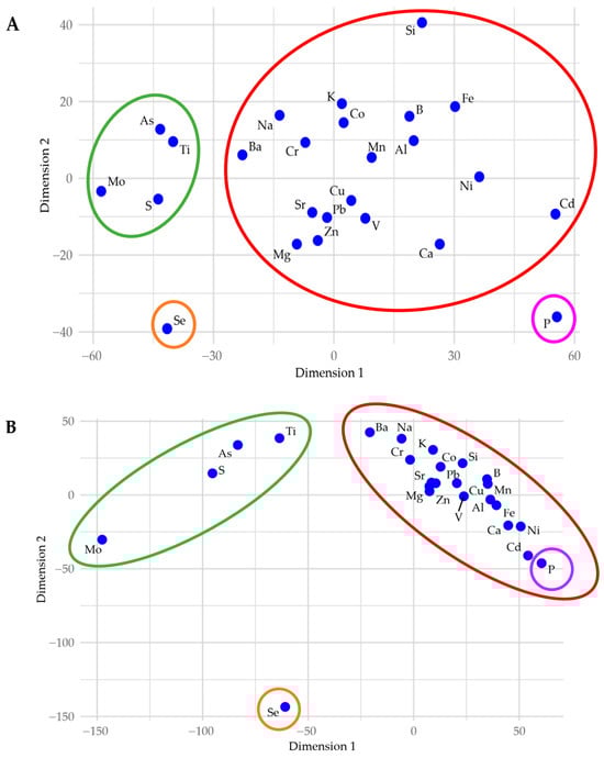 For our MDS analyses of elemental concentration (Figure 8), the Manhattan and Euclidean distance metrics had the highest Spearman rank correlations, with ρ = 0.922 and 0.875, respectively. When plotted in two-parameter MDS-space, the Manhattan and Euclidean distances form a similar distribution patterns, isolating P and Se, while creating a loose cluster with As, Mo, S, and Ti, as well as a larger cluster encompassing most other elements. The MDS plot with Canberra distances (ρ = 0.874) emphasizes this clustering pattern, further isolating Se while distancing the loose cluster of As, Mo, S, and Ti even more from the cluster of the remaining elements.