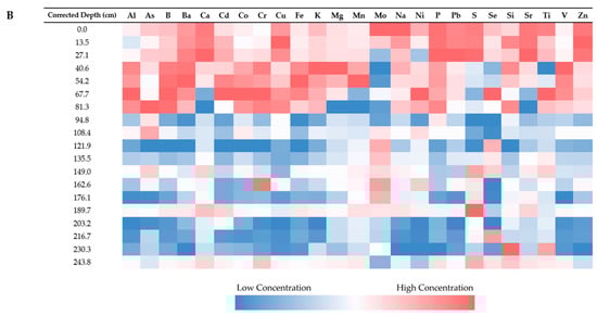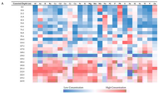 Elemental analysis with a Thermo Scientific iCAP 7400 ICP-OES allowed us to measure the concentration of the following 25 elements from our sediment core subsamples: Al, As, B, Ba, Ca, Cd, Co, Cr, Cu, Fe, K, Mg, Mn, Mo, Na, Ni, P, Pb, S, Se, Si, Sr, Ti, V, and Zn (Table 3) in the 10s of a part-per-billion (ppb) range. It should be noted that these values were derived using a partial digestion method and have most likely underestimated the concentrations for Si and Ti. Based on our results, Ca was the predominant element across all cores, followed by major elements Al, Fe, K, and Mg. Minor elements included Ba, Mn, Na, P, S, Si, Sr, and Ti, and the remaining ICP-detectable elements were considered trace elements based on their low concentrations.