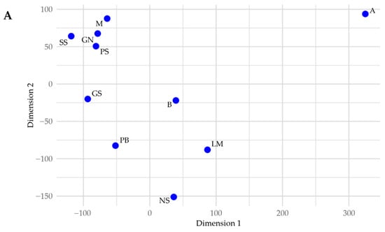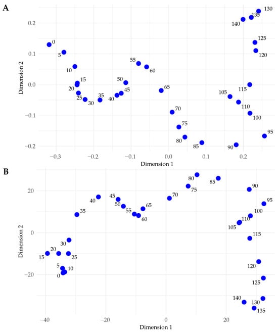 Any distance metric can be used to construct MDS plots. For our analysis, we evaluated six different distance measures: Euclidean, Manhattan, Minkowski, Canberra, Spectral Angle, and Pearson Correlation (which can be considered a measure of distance in high-dimensional space). While they can all provide insight into the relationships among our data, we give the greatest weight to the distance measures that produced the highest Spearman Rank Correlation Coefficients (ρ), as those measures are considered the best relational representations of the data. We generated these distance measures and MDS plots using R version 4.4.1 and the base R stats package.