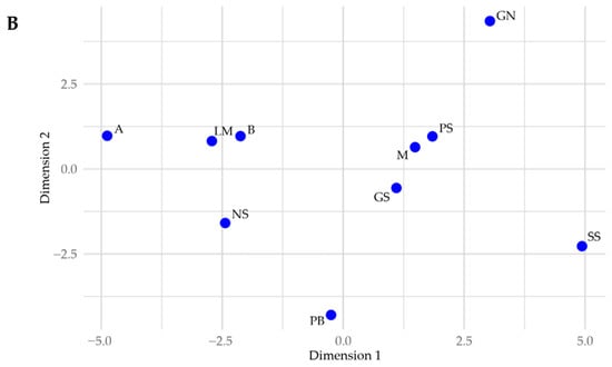 Multidimensional scaling results for all 10 sample locations using Canberra distances (A; ρ = 0.929) and Euclidean distances (B; ρ = 0.917). These plots appear to be better at identifying geochemically unique cores, such as the Airport core, rather than clustering similar cores together.