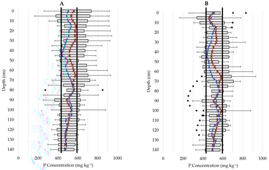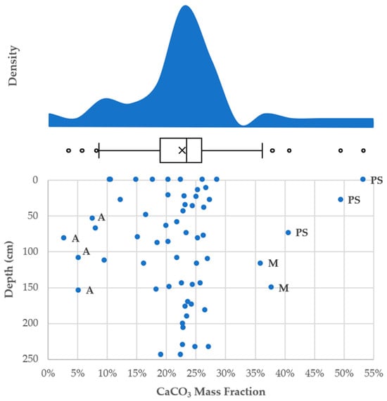 We expected P to correlate with Ca as CaCO3 coprecipitates with P. Previous studies found that Ca-bound P is one of the largest P fractions in the lake and shoreline sediments, containing over 50% of the total P [,,]. Despite this relationship, P shows only weak correlations with Ca and CaCO3 in our data (r = 0.26 and 0.27, respectively). This weak correlation can be attributed to the different geochemical behaviors of P and Ca in lake sediments. Ca tends to form stable minerals such as CaCO3, which are less prone to dissolution and mobility under typical lake conditions []. In contrast, P can exist in various forms, including forms that are more mobile and reactive. For instance, ion-exchangeable P and P bound to redox-sensitive materials can be released and migrate through the sediment under changing environmental conditions, such as variations in pH and redox potential [].