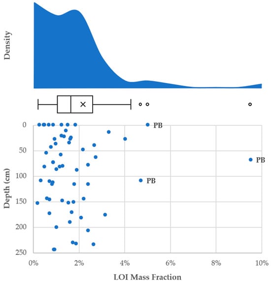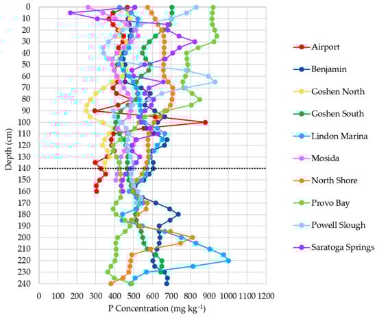 Given Utah Lake’s large area, we sought to provide a more balanced representation of sediments throughout the lake by collecting 10 deeper sediment cores. We obtained our geochemical data by analyzing our core samples for 25 ICP-OES detectible elements, fractional calcium carbonate (CaCO3), and loss on ignition (LOI) as a proxy for fractional organic matter (OM). These cores, which ranged from a depth of 140 to 240 cm below the sediment water-interface, were intentionally deep enough to include pre-settlement deposits found below 30–40 cm deep, which is the depth associated with the arrival of European settlement, as determined by previous Utah Lake sediment core studies [,,]. Because the arrival of European settlers is the only age-constraining event referenced in our study, we used sediment depth as a proxy for age and noted when significant geochemical trends occurred above or below the 30–40 cm depth range. In the absence of direct age-dating capabilities, the use of sediment depth as a proxy for age represents a practical and widely accepted approach, consistent with methodologies employed in comparable sediment core studies. We hypothesize that while European settlement may have influenced Utah Lake sediments to some extent, certain lakebed features, such as sediment P profiles, are more likely dominated by natural processes and not significantly impacted by European settlement [,,].