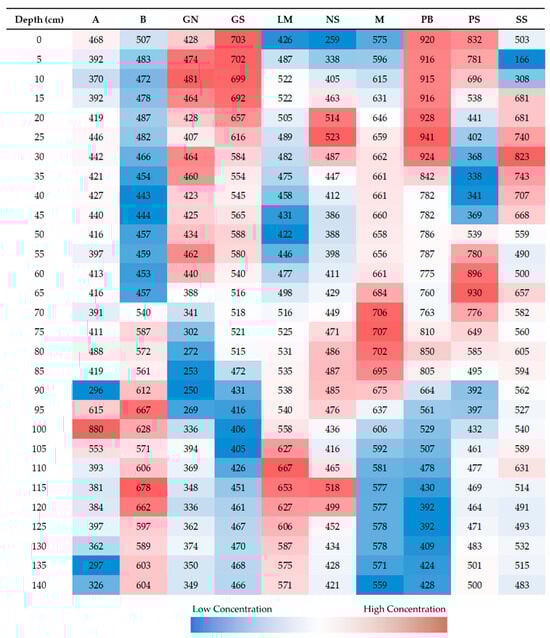 In summary, a variety of relationships exists between elemental concentration and sample depth. Mn, Al, Fe, K, and V often increase with depth, whereas Ba, Cu, Pb, Sr, and Zn often decrease with depth. For the three cores with larger anthropological impacts (i.e., A, PB, and BG), P decreases with depth unlike the majority of the lake. We found Se, Cr, Mo, Si, B, Cu, P, S, Ti, and Zn concentrations tend to remain consistent with depth. Broad trends in elemental concentration are often observed in Utah Lake sediments, with most core samples exhibiting a general increase with depth, although the opposite trend has been observed in some cores. Canberra and Manhattan distance metrics indicate that a geochemical shift occurs in Utah Lake sediments between 30 and 40 cm deep, coinciding with the arrival of European settlers, with Pb concentrations being the most visible indication of this trend [,,].