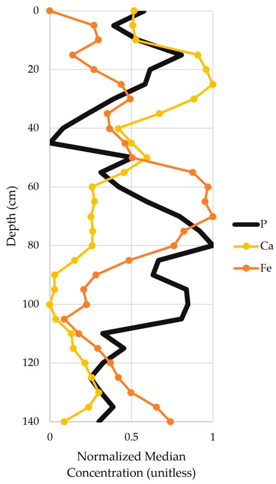 Median normalized concentration for P, Ca, and Fe for all 10 core samples.