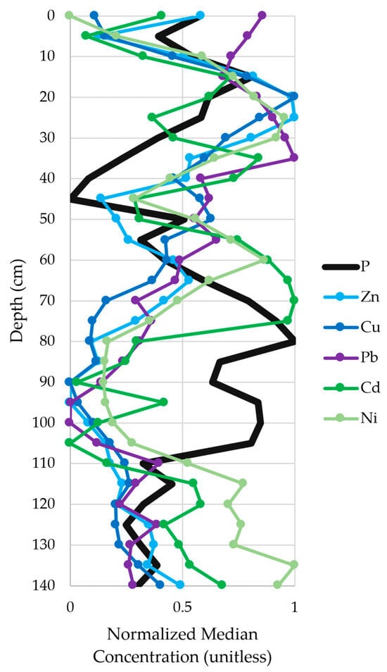 Median normalized concentrations for P and strong to moderately correlated immobile pollutants, including Zn, Cu, Pb, Cd, and Ni.