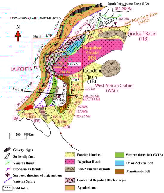 Geological sketch map of the Variscan belts in West Africa and North America, modified from [1], with indication of local geological schemes of this study. AA—Anti-Atlas Belt; AS—Adrar Souttouf Massif; SB—Senegalese Block; MM—Moroccan Meseta; PB—Plage Blanche; ZM—Zemmour massif; TIB—Tindouf Basin; TB—Taoudeni Basin; KB—Koulountou Block; BB—Bové Basin; GPB—Guinean Paleozoic Basin; FL-SB—Florida or Suwanee Basin; SApp—Southern Appalachians; Napp—Northern Appalachians; VP—Virginia promontory; PE—Pennsylvania Embayment; NYP—New York Promontory; AK—Akjoujt. Numbers—Ages of deformations presented in Ma.