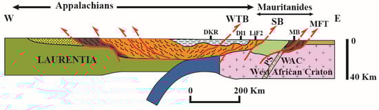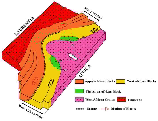 Block diagram that illustrates the tectonic model for the imprint of the Reguibat shield onto the Southern and Central Appalachians (modified from [13]). West African Blocks include the Mauritanide belt, the Senegalese block and the WTB (Western Thrust Belt). The Appalachian bloc is an orange colour.