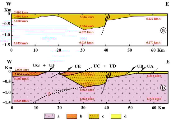 (a): W-E seismic profile across the Adrar Souttouf Massif (Fateh [38]). (b) Geological interpretation of the seismic profile in Adrar Souttouf Massif. Legend: Allochthonous or exotic terranes (Units E, F and G), African terranes (Units B, C and D), Palaeozoic cover (Unit UA). a: Reguibat basement; b: allochthonous units; c: African units; d: Tindouf basin sediments.