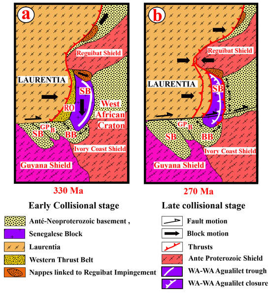 (a,b) Two different stages of the collision between the Laurentia and the West African Craton during the last period of the Variscan Orogeny and after the tectonic escapes (modified from Villeneuve et al. [41]). SB—Suwannee (or Florida) Basin; GPB—Guinean Palaeozoic Basin; BB—Bové Basin; SB—Senegalese Block; RO—Rheic Ocean.