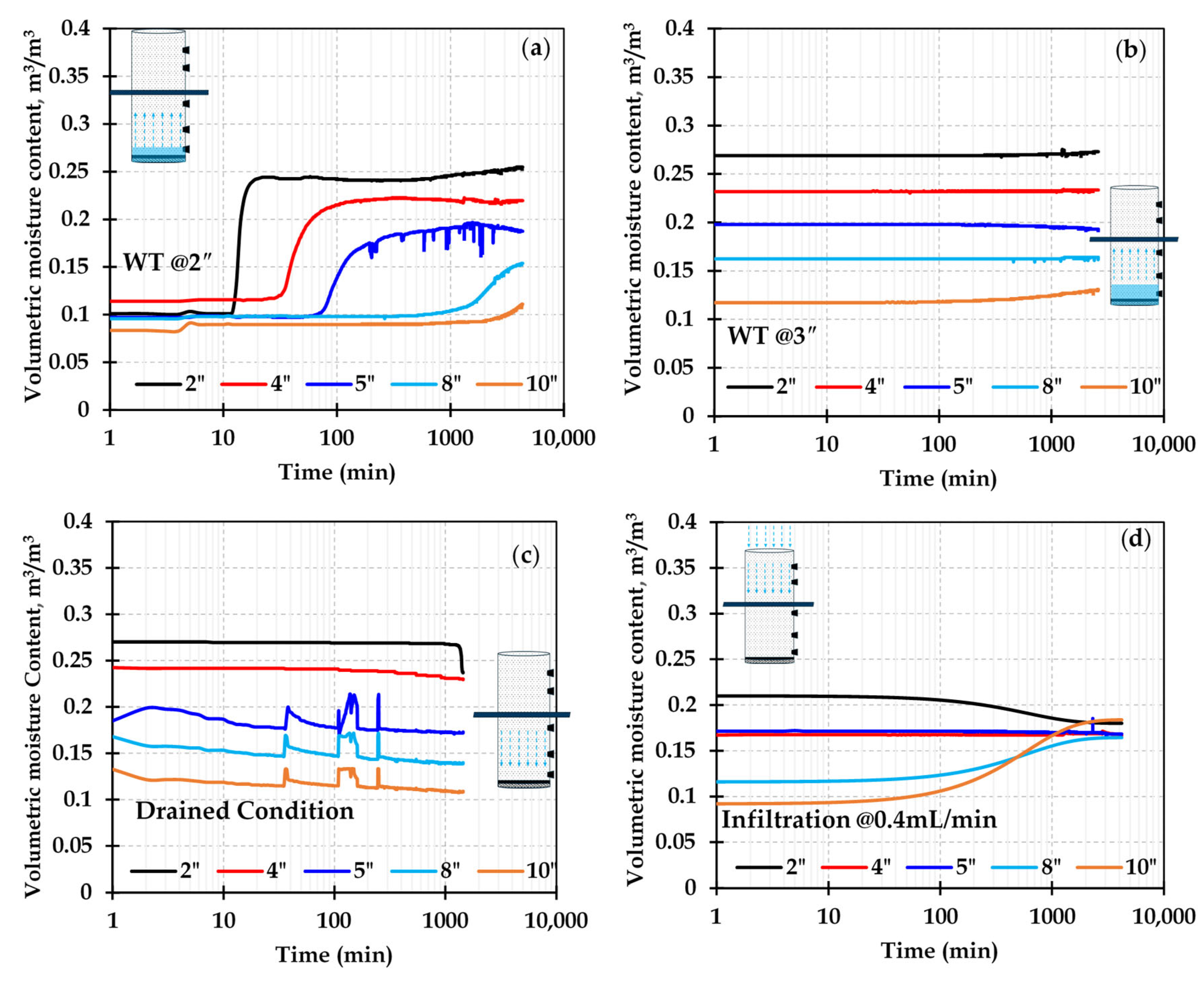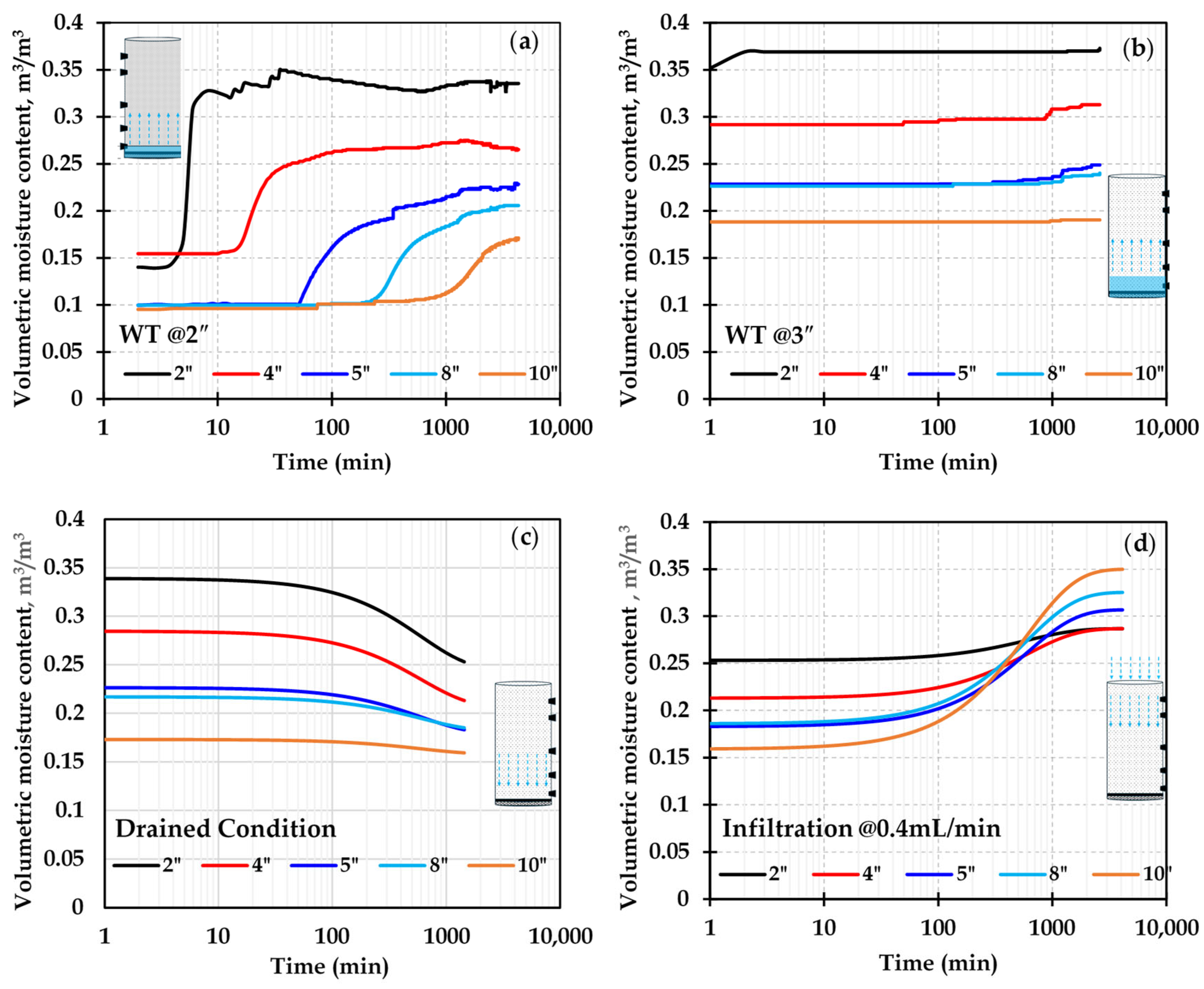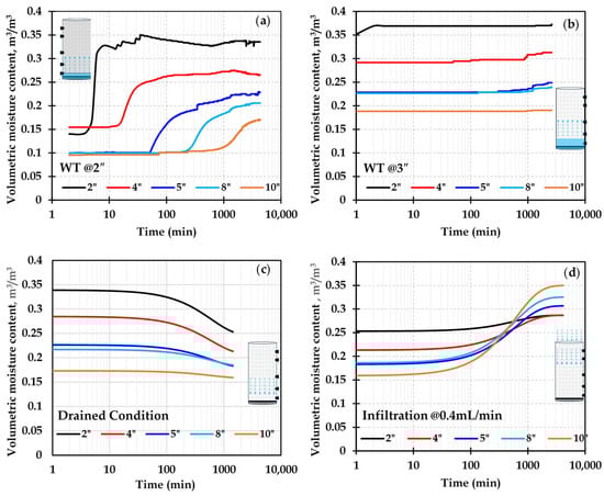 Moisture contour plots with time for the control column along different stages: (a) water table at 2″ from base, (b) water table at 3″ from base, (c) drained condition, (d) infiltration at the rate of 0.4 mL/min.