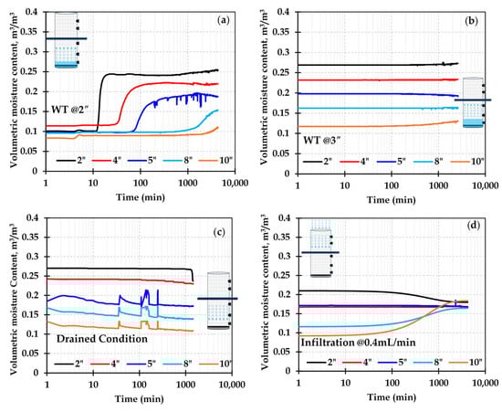 Moisture contour plots with time for the column with a non-woven textile along different stages: (a) water table at 2″ from base, (b) water table at 3″ from base, (c) drained condition, (d) infiltration at the rate of 0.4 mL/min.