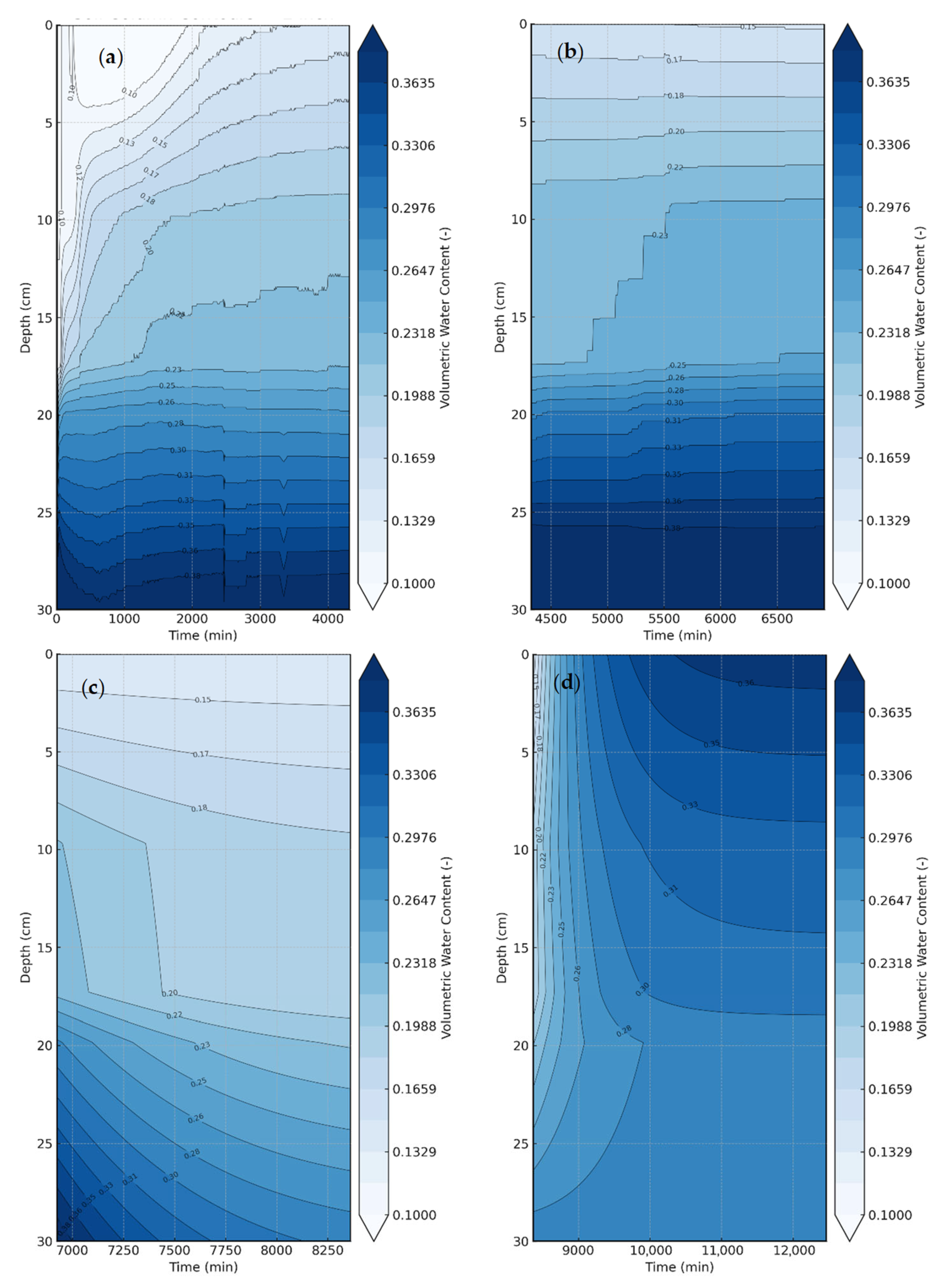 Figure 6. Furthermore, the contour plots of volumetric moisture distribution were generated from the measured time-series data using interpolated sensor readings throughout each hydraulic stage. The volumetric water content values obtained at different depths and discrete time intervals were processed using bilinear interpolation to estimate intermediate values across the entire 30 cm column domain. The resulting matrix was then contoured using a uniform color scale to represent the spatial and temporal evolution of moisture within the column. The upper and lower boundary conditions corresponded to the saturated and the dry surface, respectively. Each contour band thus represents a line of equal volumetric water content (θ), enabling visualization of the advancing and receding wetting fronts with time. The corresponding contour plots of volumetric moisture distribution with time and depth are shown in
