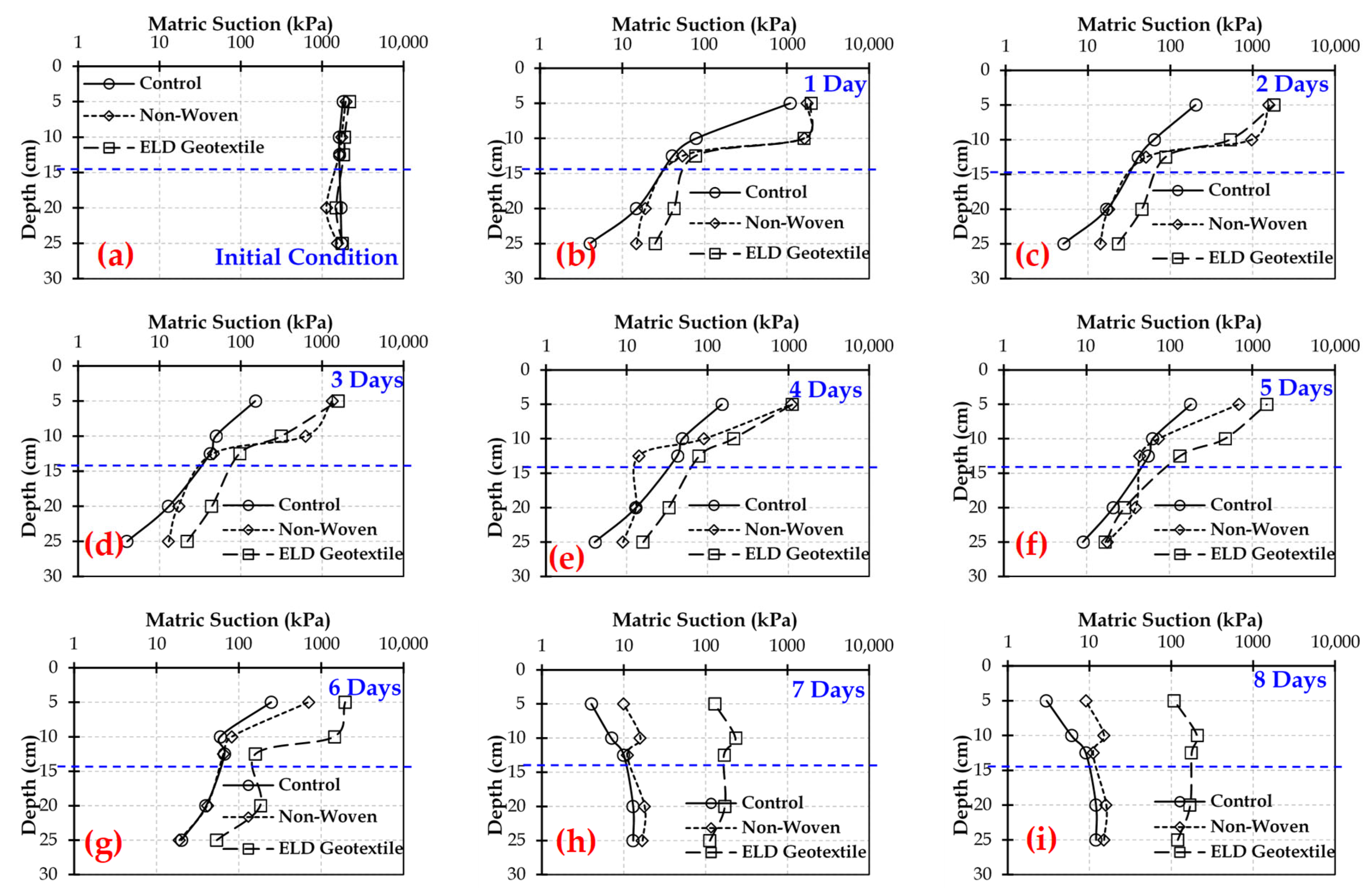 The daily variation of volumetric moisture content and matric suction with depth for the control column, the non-woven geotextile column, and the ELD geotextile column is presented in