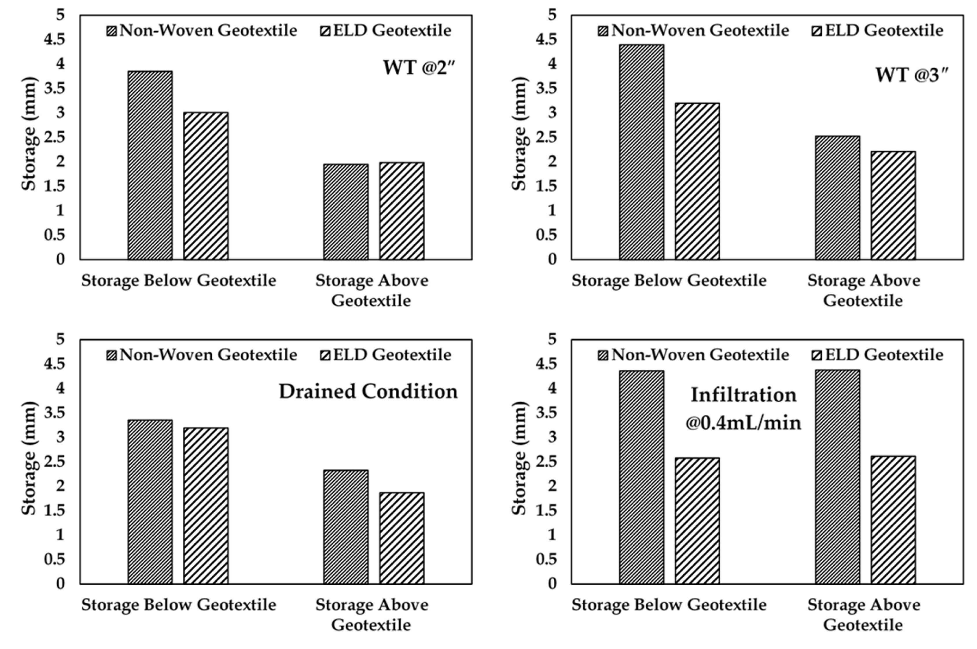 Comparison of moisture storage above and below non-woven and ELD geotextiles at different stages.