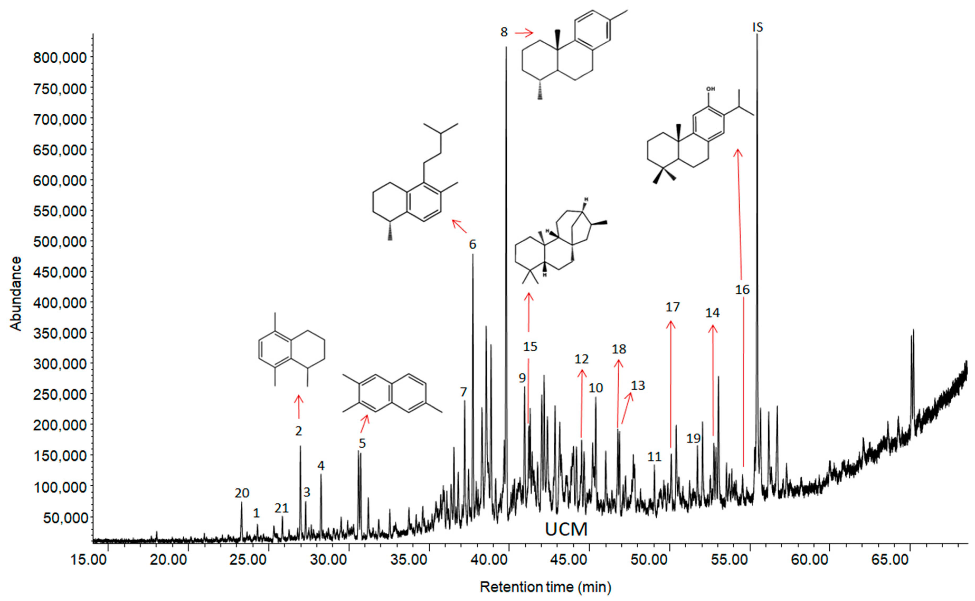 | 13 | Dehydroabietane | C20H30 | 270.5 | I |
