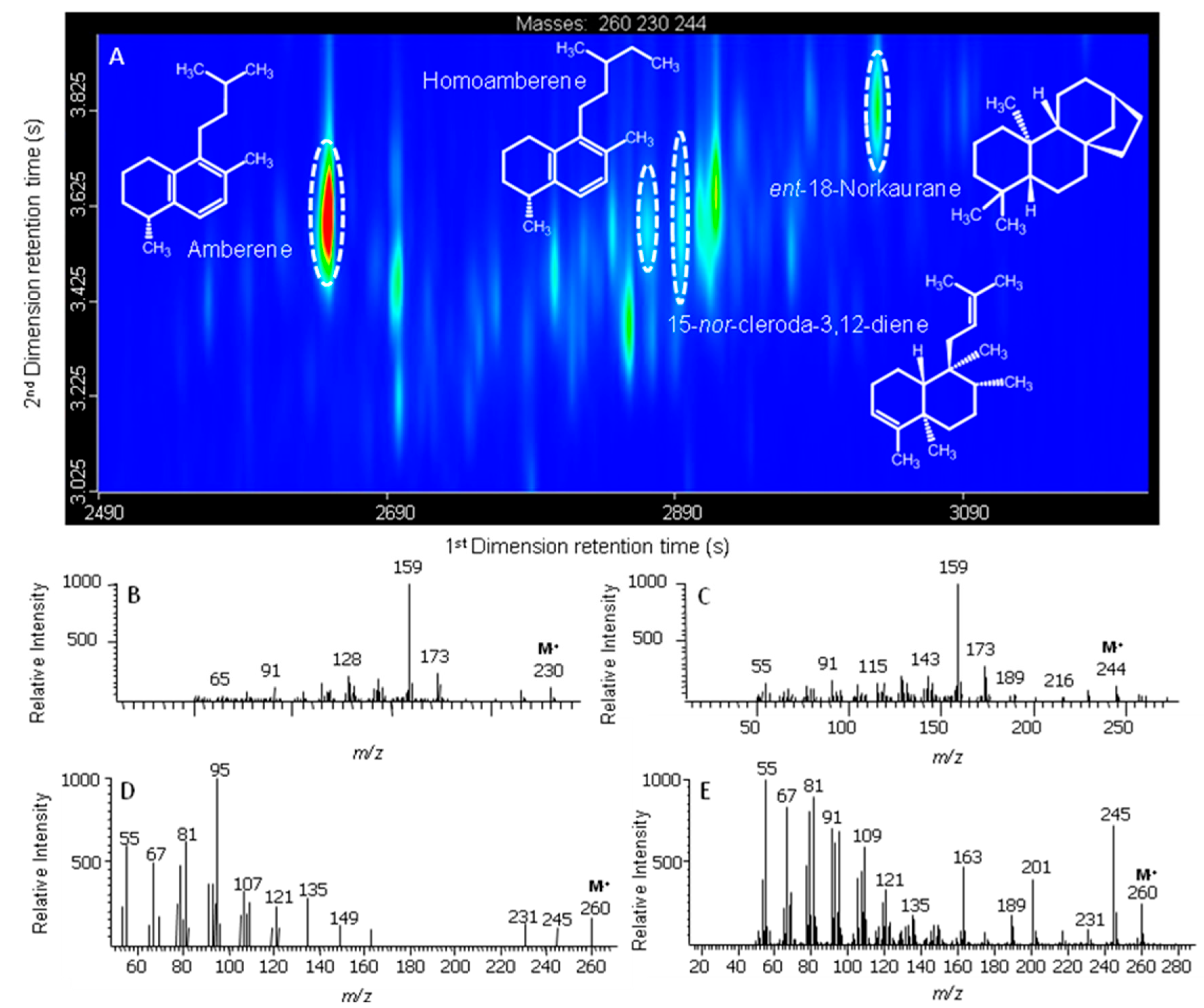 - Wang, Y.M.; Jiang, W.Q.; Feng, Q.; Lu, H.; Zhou, Y.P.; Liao, J.; Wang, Q.T.; Sheng, G.Y. Identification of 15-nor-cleroda-3,12-diene in a Dominican amber. Org. Geochem. 2017, 113, 90–96. [Google Scholar] [CrossRef]