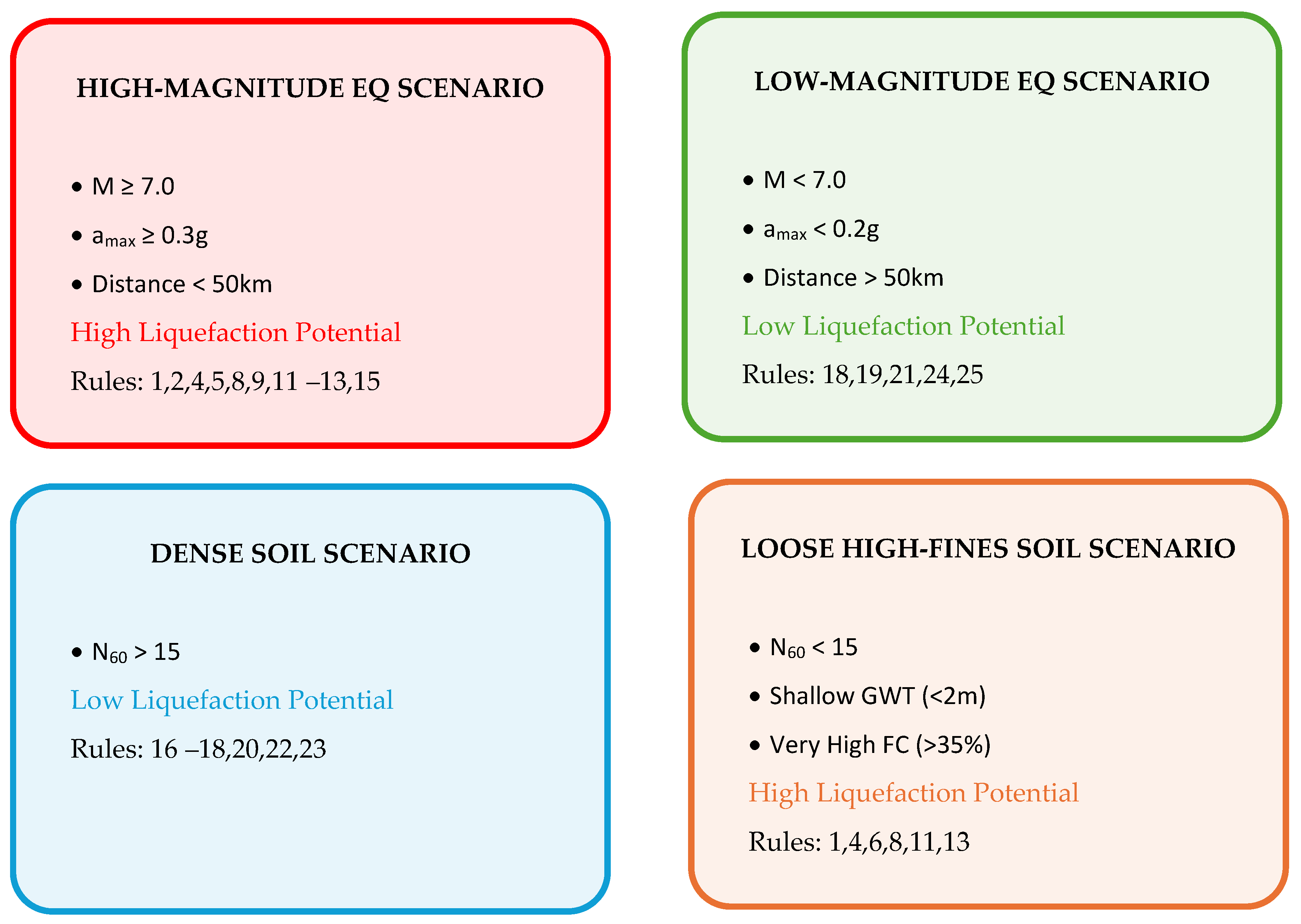 | Rules | M | amax (g) | R (km) | Avg Depth (m) | GWT | Avg Nm | FC (%) | Liq |