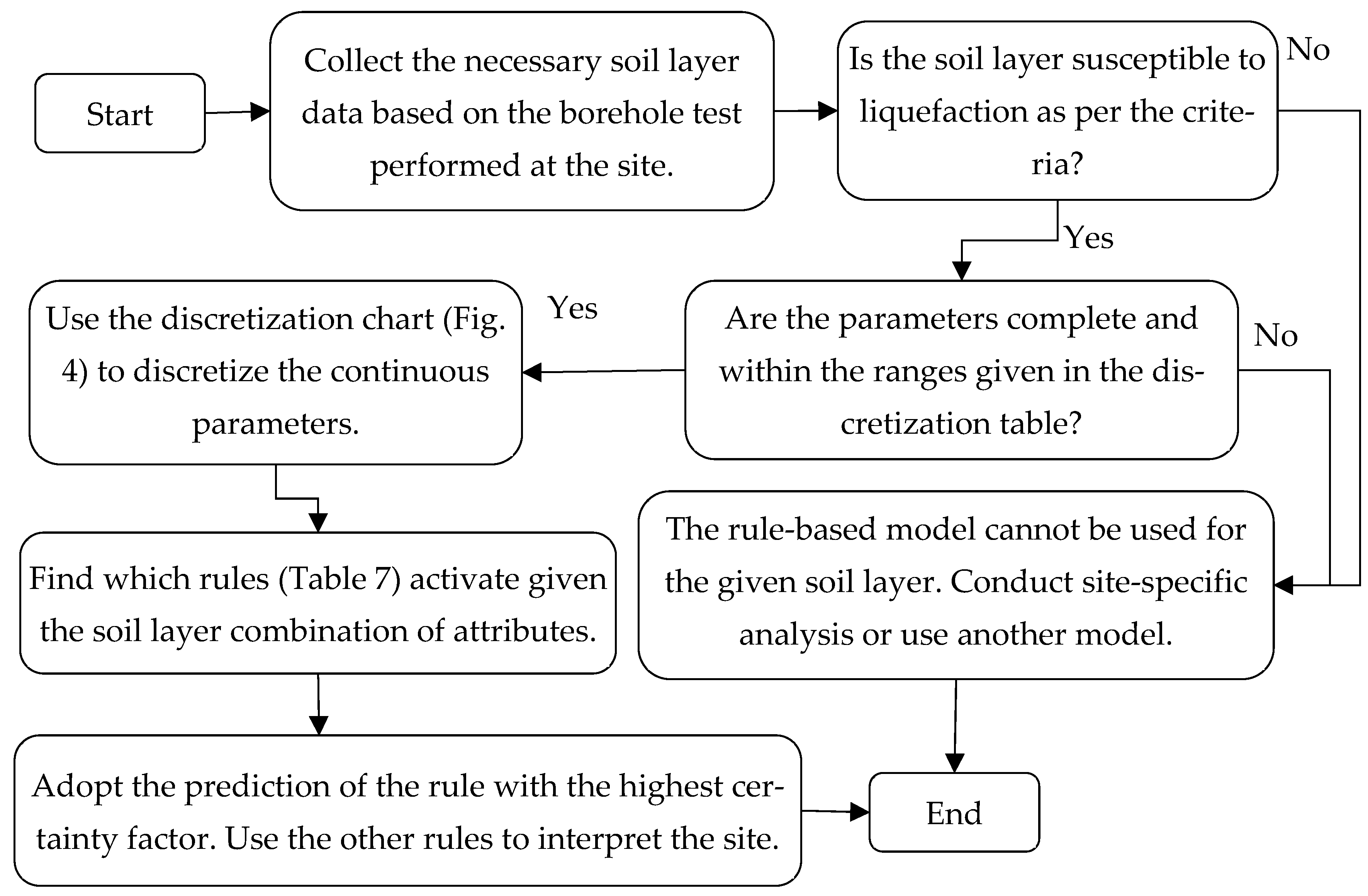 - Prediction and Interpretation: The final liquefaction prediction is determined by the activated rule with the highest certainty factor. Any remaining activated rules are used to aid interpretation of the site conditions. If no rule is activated, this indicates that similar site conditions are not represented in the historical dataset, and the rule-based model is considered not applicable for that site.
