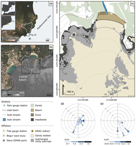 (a) Location map of Castell beach, including the location of the tide gauge station (Barcelona II), Begur buoy, Torroella de Montgrí rainfall station and SIMAR 2122142 point; and Aubi stream and its drainage basin. (b) Orthophoto collected in 2020 and a backscatter map of shoreface, including the location of the AWAC. (c) Cartographic map of the main features of the area. (d,e) Wave roses of SIMAR 2122142 point (d) and AWAC (e) during the AWAC deployment period (March–July 2020). Subaerial topography in (a), orthophoto in (b) and forest land use in (c) were provided by the Institut Cartogràfic i Geològic de Catalunya; while backscatter data in (b) are part of the ESPACE Project dataset (2004).