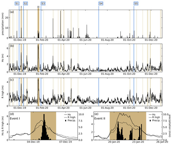 Time series of (a) hourly precipitation and (b) significant wave height , derived from Torroella de Montgrí precipitation station and SIMAR point 2122142, respectively (see Figure 1a for location). (c) Maximum storm-induced water level () considering the mean foreshore slope () during the study period. (d,e) Zoomed-in time series of (solid line), (dashed line), and precipitation (black bars) during Events I and II. Yellow bars indicate storm events over the study period, with the most energetic storm highlighted in dark yellow. Survey campaigns (S1 to S5) are indicated by blue boxes above the panels and by blue vertical lines in (a–c); see Table 1 for details.