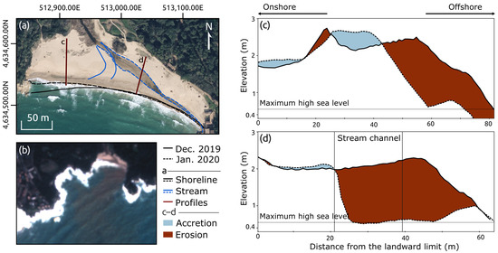 On the other hand, stream sediment delivery was evidenced mainly by two features. Firstly by the plume observed beyond the bay on 23 January 2020 (Figure 3b), two days after the peak of Event II, which likely corresponds to offshore export of fine sediments supplied by the stream [34]. Secondly by the subaqueous delta that formed near the stream outlet, inferred from the seaward displacement of the 1–1.5 m depth contours observed after Event II (Figure 5a), resulted from the deposition of the sandy fraction supplied by the stream.