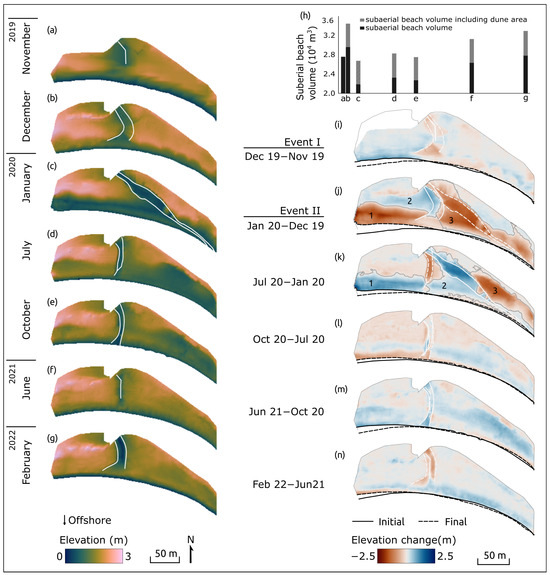 (a–g) Digital elevation models of the subaerial beach; (h) subaerial beach volume (black bars) and subaerial beach volume including the dune area (hatched bars) for each survey (a–g); and (i–n) morphological changes between campaigns (final−initial; Month yy−Month yy), including differential elevation, shoreline and stream positions (black and white, respectively), with initial (solid line) and final (dashed line) states.