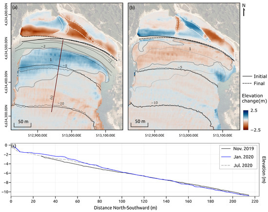 Between Survey 3 (29 January 2020) and Survey 4 (8 July 2020), bathymetric differences indicated sediment losses of approximately from the deposit formed by Event II at depths between 1 m and 4 m (Figure 5b, zone 1). The seabed lowered on average by , reaching a maximum of . Beyond 4 m depth, no significant changes were observed, apart from the banding effect (Figure 5b).