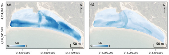 Beach elevation variability expressed as standard deviation (SD). (a) SD calculated from the study surveys (Table 1, excluding Survey 1 due to differences in spatial coverage compared with the other campaigns). (b) SD calculated from annual LiDAR surveys (2012–2017).