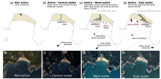 (a–d) Conceptual diagrams illustrating stream outlet configurations: (a) non-active, (b) central outlet, (c) west outlet, (d) east outlet. (e–h) Corresponding imagery of each configuration: (e) ICGC orthophoto from 16 May 2019, (f) Sentinel-2 image from 17 July 2018, (g) ICGC orthophoto from 24 January 2017, and (h) ICGC orthophoto from 27 January 2020. Arrows indicate wave direction and coastal impact, whereas shaded areas denote sediment accumulation associated with stream input.