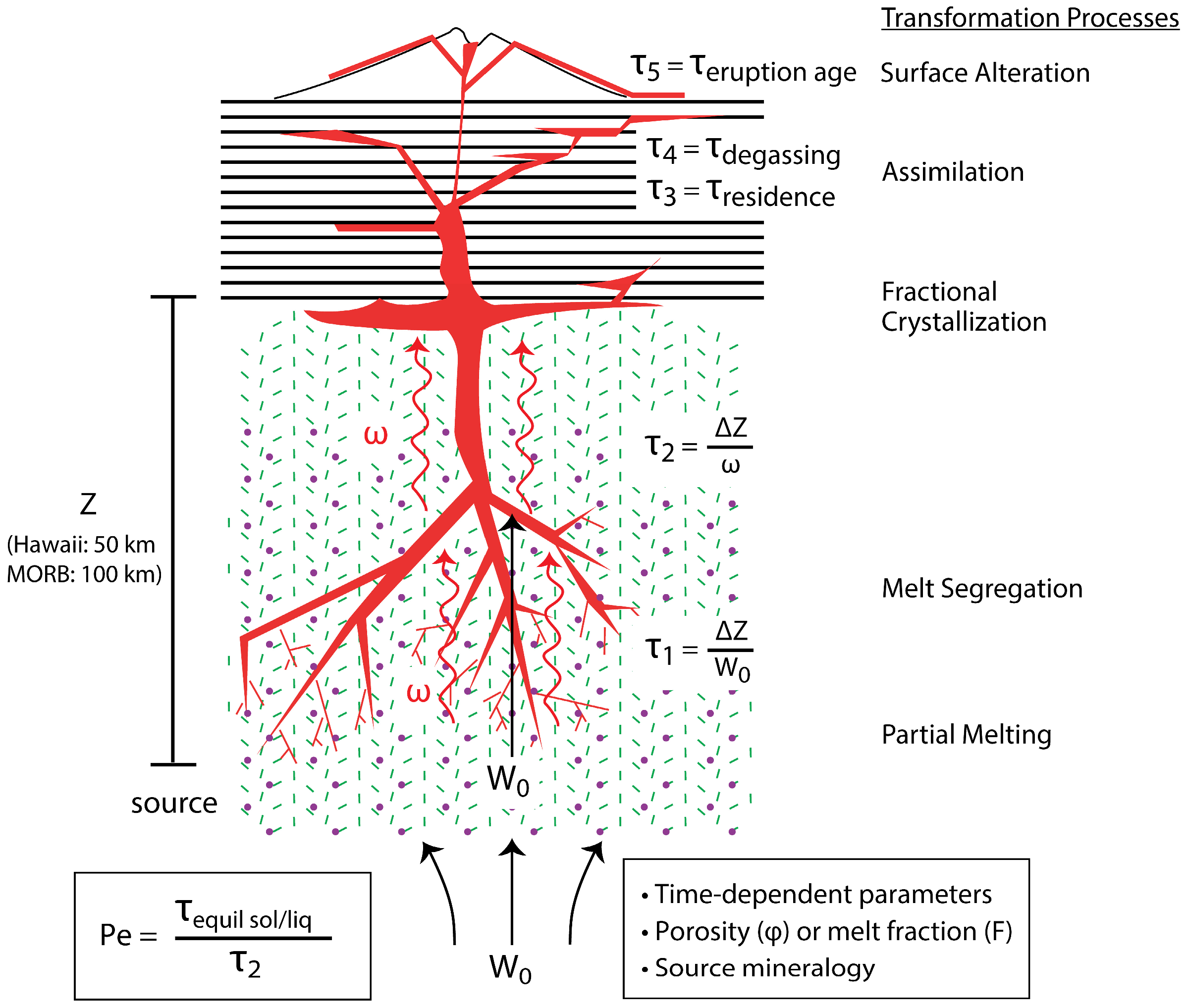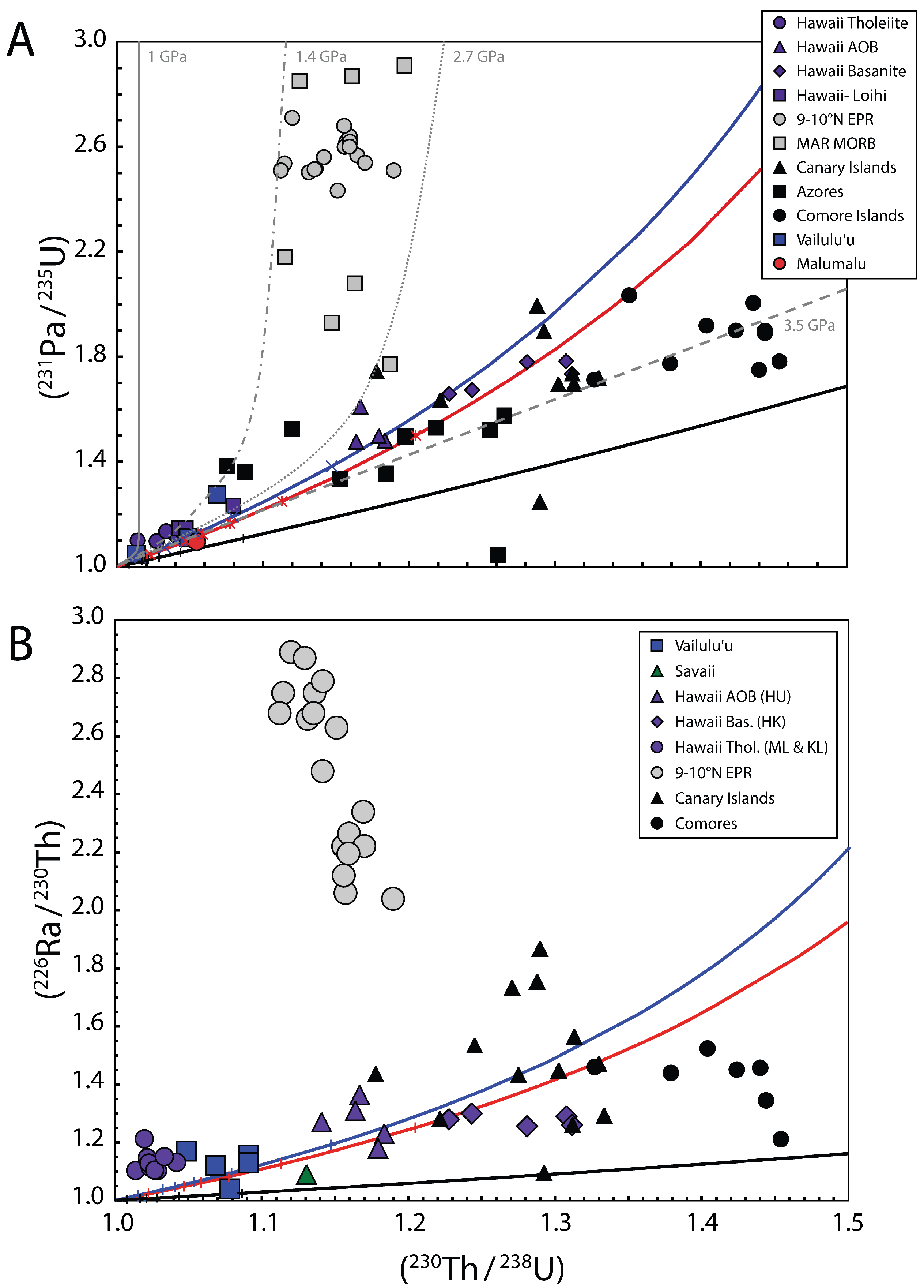 - Defining the timescales of magma genesis during decompression mantle melting. The formation and transport of basaltic magma in the mantle during adiabatic decompression can be characterized in terms of the velocity of the upwelling solid mantle; the rate of melting; the melt velocity; melt transport processes (timescale, focused and diffuse, closed or open system); and the delay time, or storage time, of magma before eruption. While the velocity of upwelling mantle and the corresponding melting rate can be estimated from models coupled with thermodynamic data and geophysical observations (e.g., [29,30,146,264]), the melt velocity and magma storage times are difficult to estimate from first principles and require measurement. Fortunately, because the daughter isotopes 230Th and 226Ra of the 238U decay series and the daughter isotope 231Pa of the 235U decay series have half-lives that bracket the timescales over which melting and melt extraction are thought to occur, measurements of (230Th/238U), (226Ra/230Th), and (231Pa/235U) ratios in young basaltic lavas provide unique information on the timescales and modes of melt generation and transport.