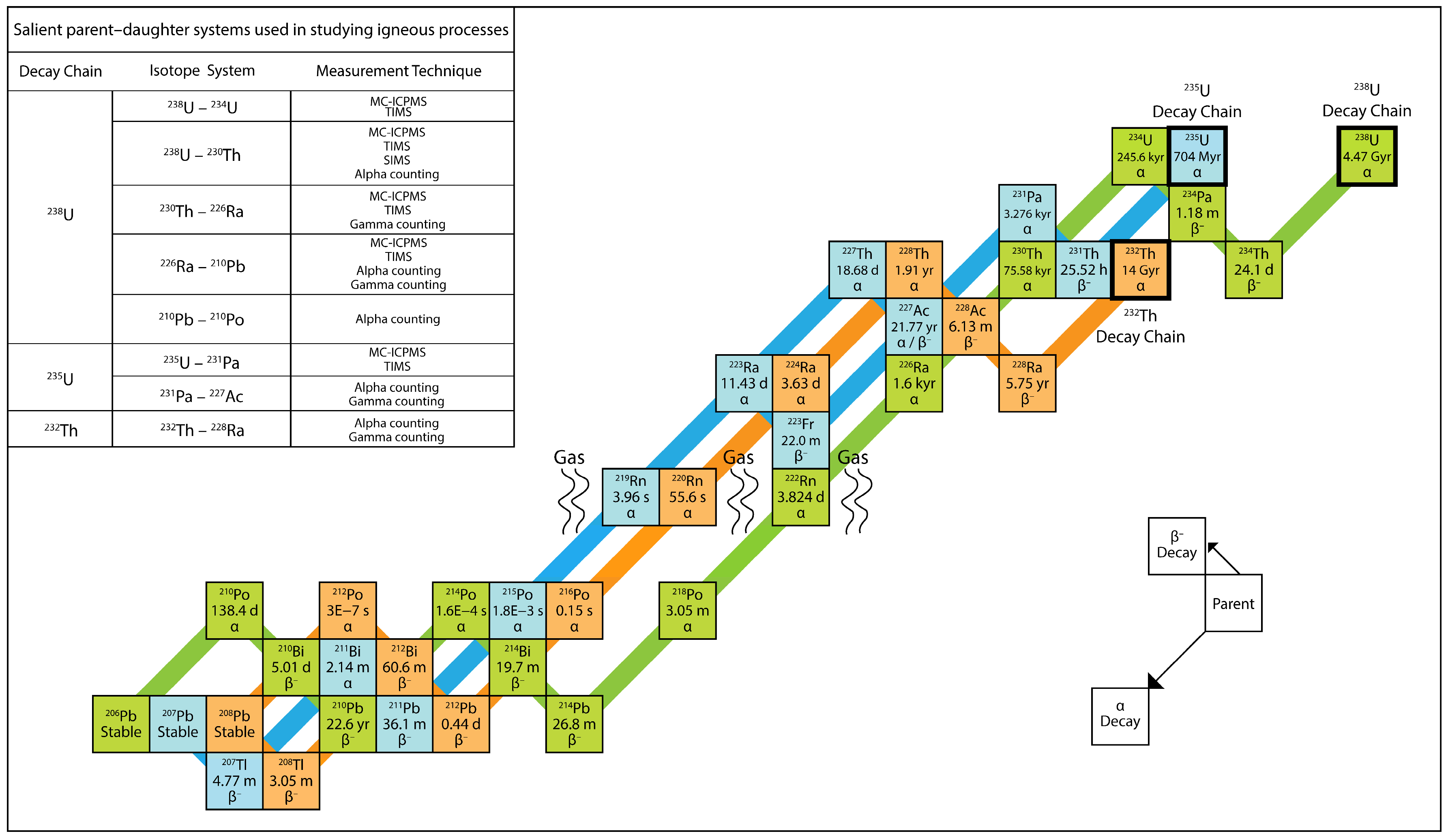 - Section 6 provides a historical overview of current and past analytical methodologies used to measure 238U, 235U, and 232Th decay series isotopes. We highlight recent improvements in mass spectrometry that have greatly influenced this field of study, as well as the alpha counting methods used for 210Pb-210Po measurements.