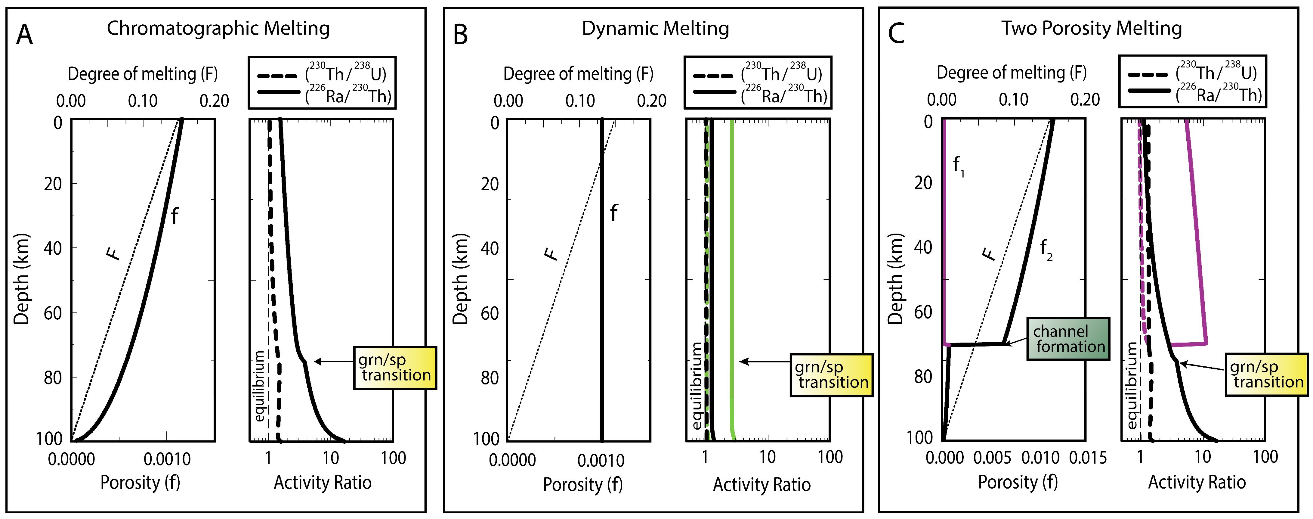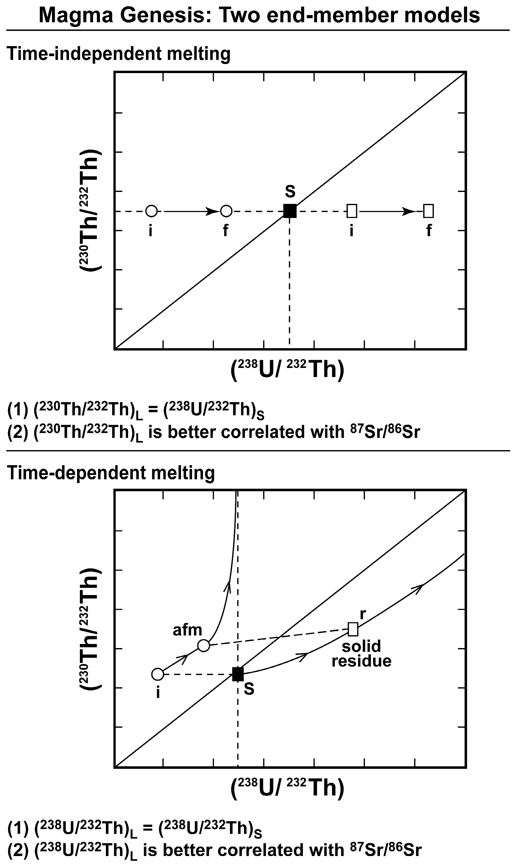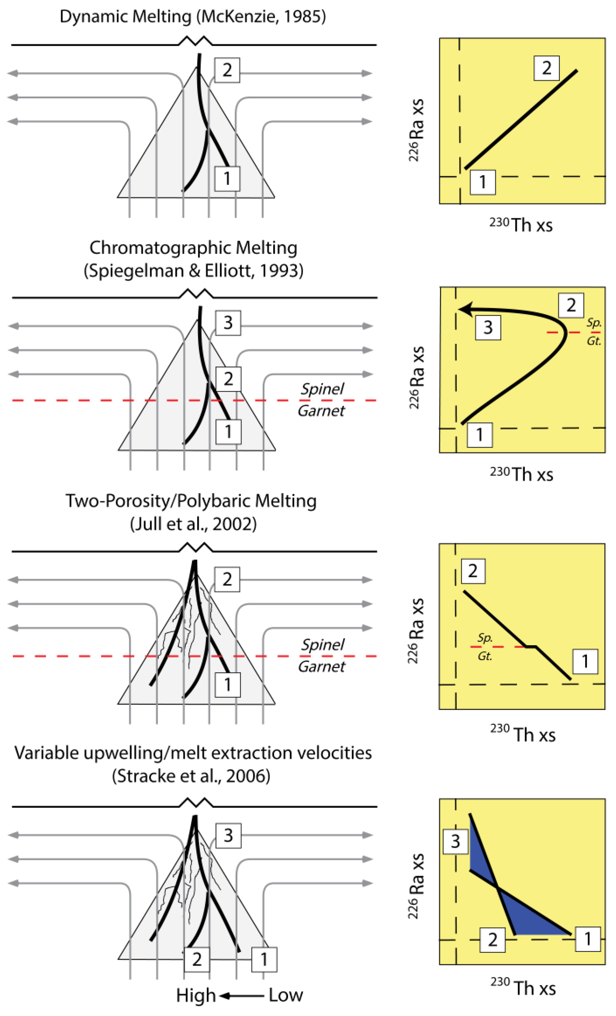 - Section 3 examines the geochemical principles and assumptions particular to the application of the 238U, 235U, and 232Th decay series to decompression mantle melting in oceanic settings. It focuses on the differences between time-independent melting models such as batch and tractional melting, which rely solely on elemental fractionation, and time-dependent melting models that in turn take into consideration the timescales of melting and incorporate daughter ingrowth during melting. Specific examples of how different melting models and different lithologies produce divergent results, as well as the reasoning behind interpreting and selecting any model over another, are then considered. Melt generation at both divergent plate boundaries (MORB) and intraplate hotspots (OIB) are assessed.