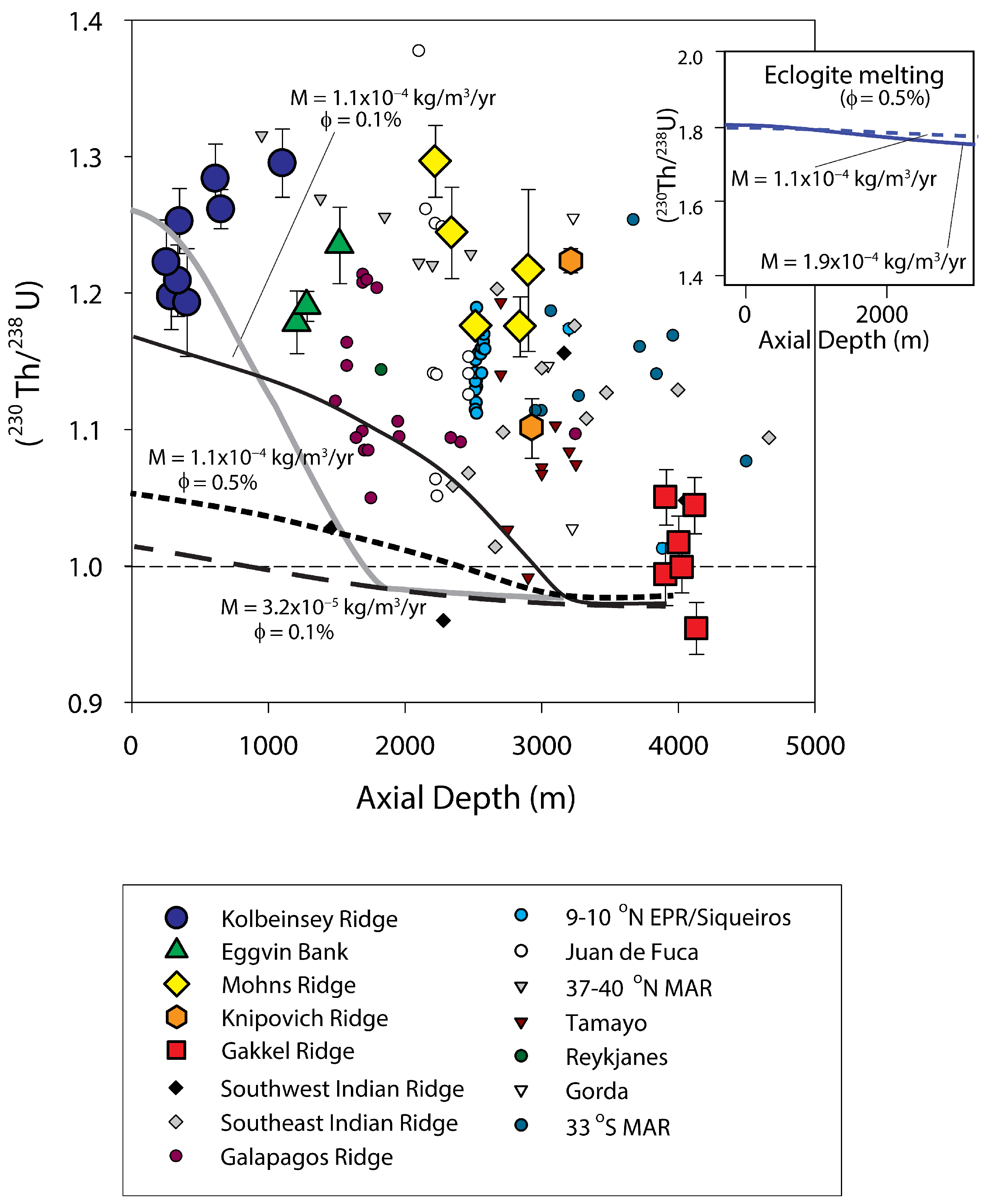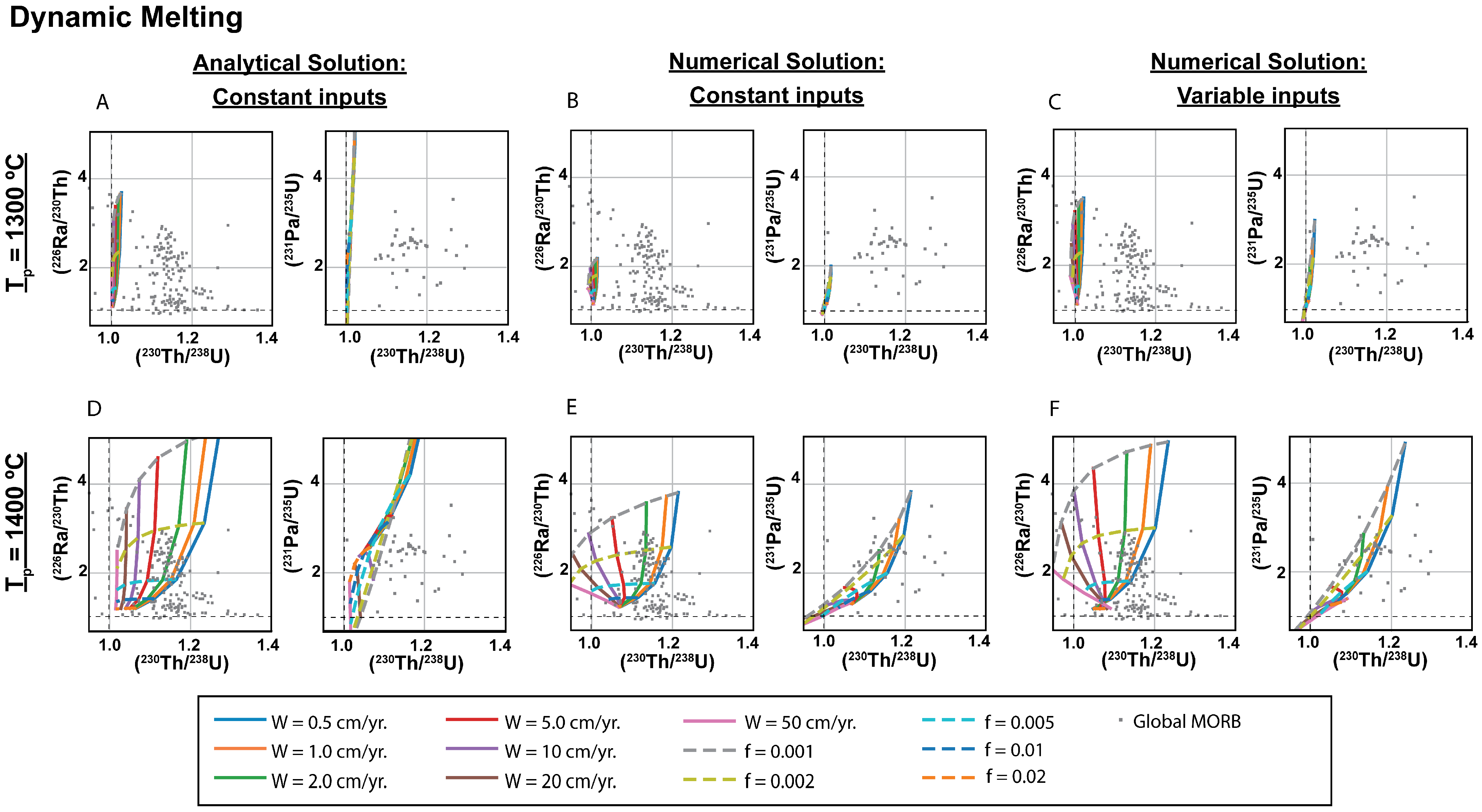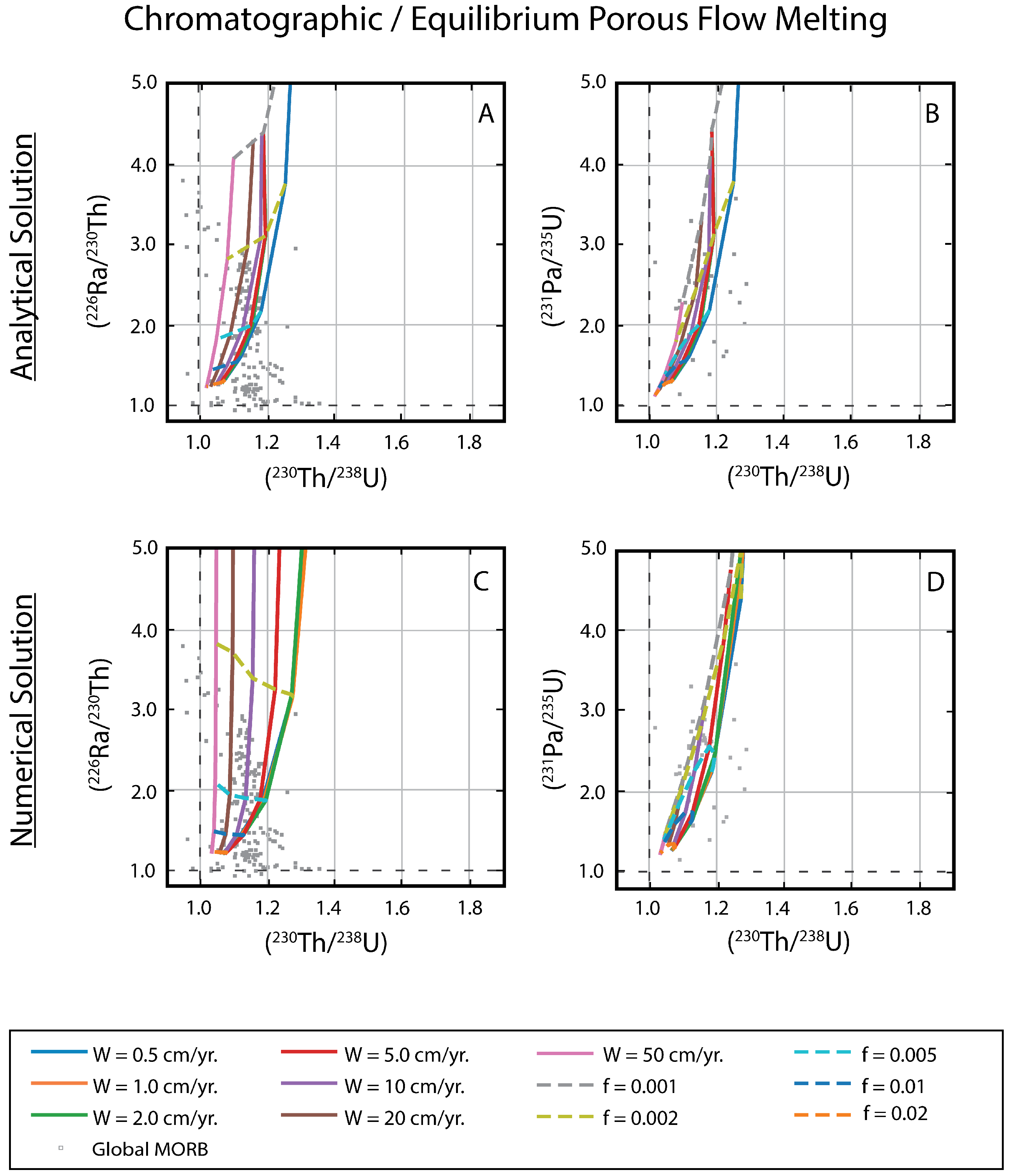 - Section 3 examines the geochemical principles and assumptions particular to the application of the 238U, 235U, and 232Th decay series to decompression mantle melting in oceanic settings. It focuses on the differences between time-independent melting models such as batch and tractional melting, which rely solely on elemental fractionation, and time-dependent melting models that in turn take into consideration the timescales of melting and incorporate daughter ingrowth during melting. Specific examples of how different melting models and different lithologies produce divergent results, as well as the reasoning behind interpreting and selecting any model over another, are then considered. Melt generation at both divergent plate boundaries (MORB) and intraplate hotspots (OIB) are assessed.