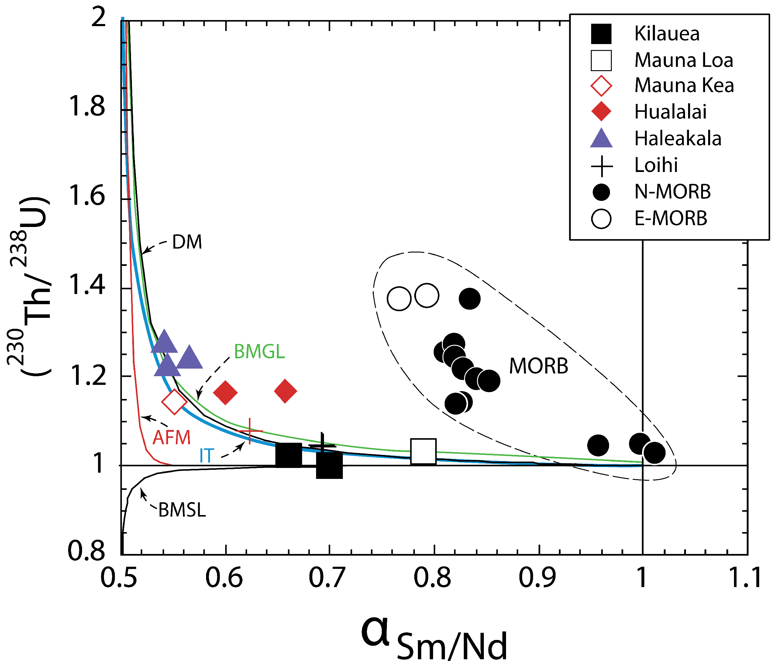 - Sims, K.W.W.; DePaolo, D.J.; Murrell, M.T.; Baldridge, W.S.; Goldstein, S.J.; Clague, D.A. Mechanisms of magma generation beneath Hawaii and mid-ocean ridges: Uranium/thorium and samarium/neodymium isotopic evidence. Science 1995, 267, 508–512. [Google Scholar] [CrossRef] [PubMed]