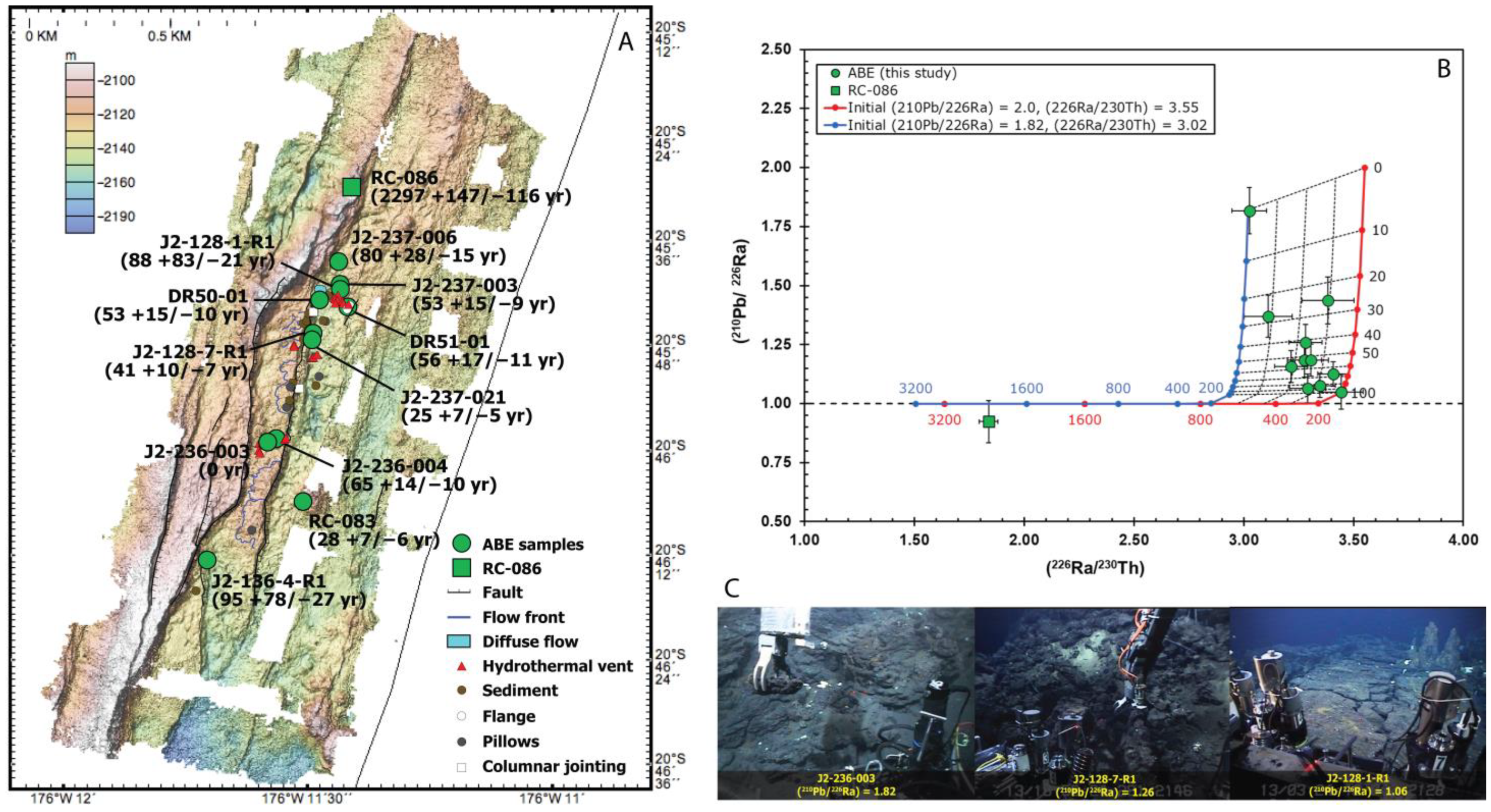 - In a study of the EPR, Tolstoy et al. [232] found a 2+ year buildup of seismic activity preceding a sudden drop in seismic activity on 22 January 2006. While this event was interpreted as a singular eruption along the East Pacific Rise, the 210Po dates in lava samples from this event show a wider range of eruption dates, from June 2005 to January 2006 [232]. The apparent discrepancy between the calculated ages and seismic observations is controversial; however, a simple interpretation that reconciles this discrepancy is that the 210Po ages may reflect the buildup of seismic activity representing numerous smaller, distant eruptive events rather than precursors to a singular eruptive event.