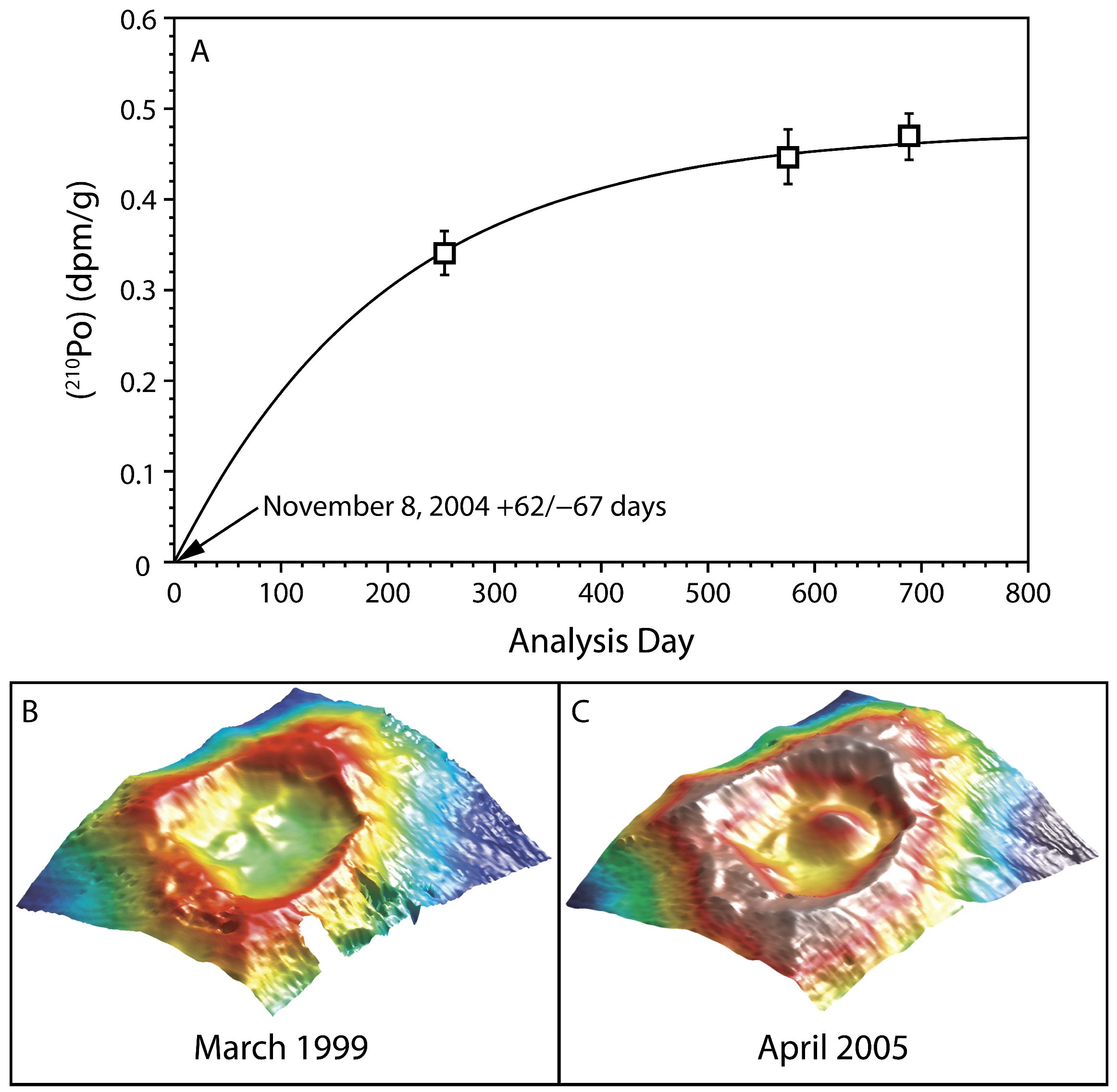 - In a study of lavas from Vailulu’u and Malumalu in Samoa, Sims et al. [42] demonstrate that the calculated 210Po age, which provides an eruption date of 8 November 2004 (+62 days/–67 days), falls within a window of bathymetric imaging showing new dome growth occurring sometime between March 1999 and April 2005 (Figure 33).