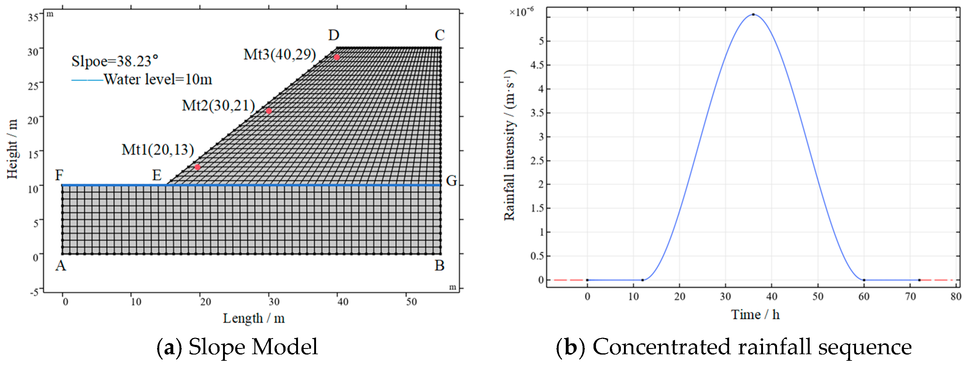 - Nian, G.; Chen, Z.; Zhang, L.; Bao, M.; Zhou, Z. Treatment and application of two boundary conditions in slope rainfall infiltration. Rock. Soil Mech. 2020, 41, 4105–4115. (In Chinese) [Google Scholar] [CrossRef]
