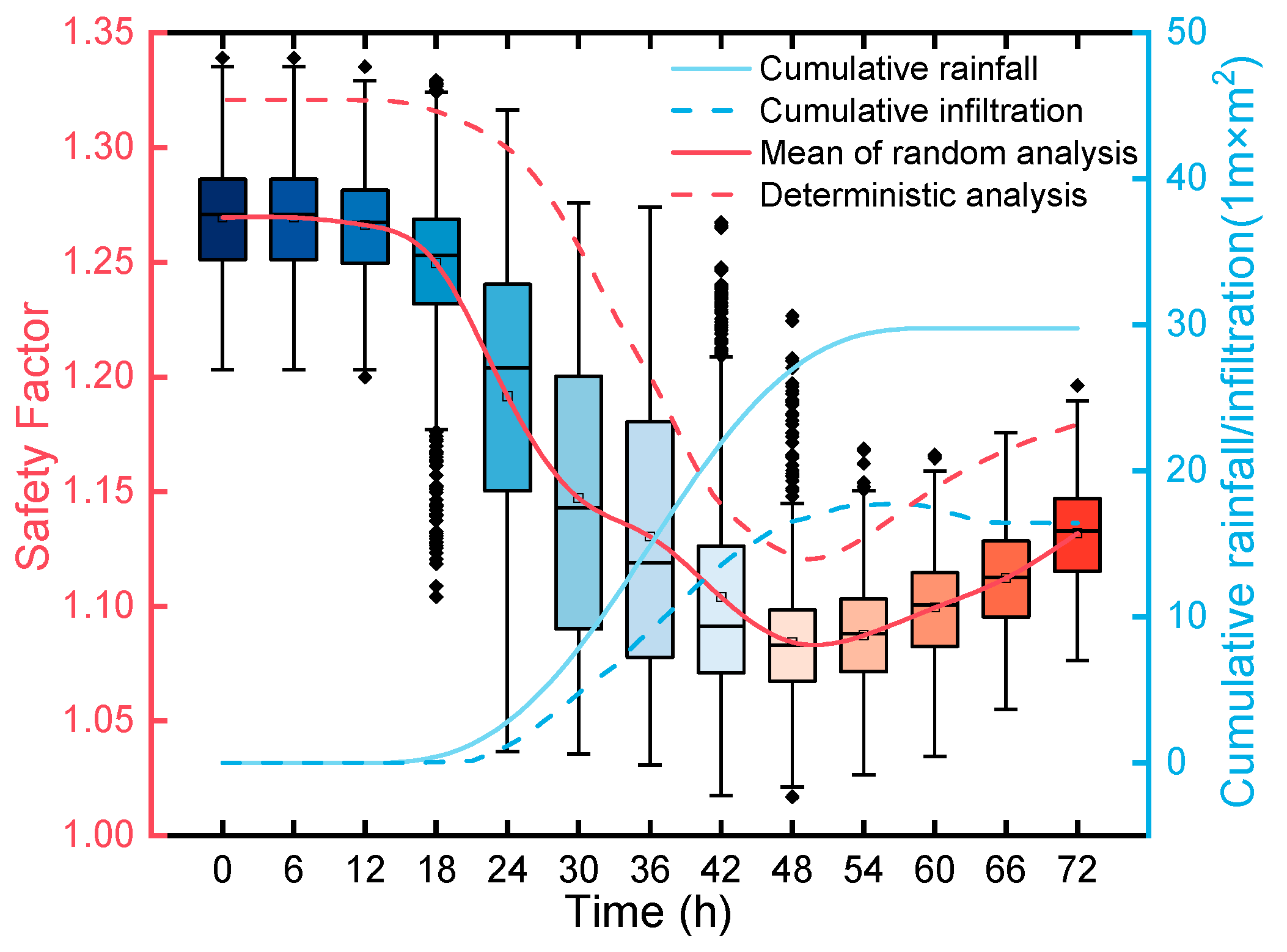 | Probabilistic methods: Neglect of time-varying effects | Dynamic simulation across distinct rainfall stages (e.g., initial infiltration, saturation, post-rainfall) tracks temporal evolution of safety factors and failure probability. |