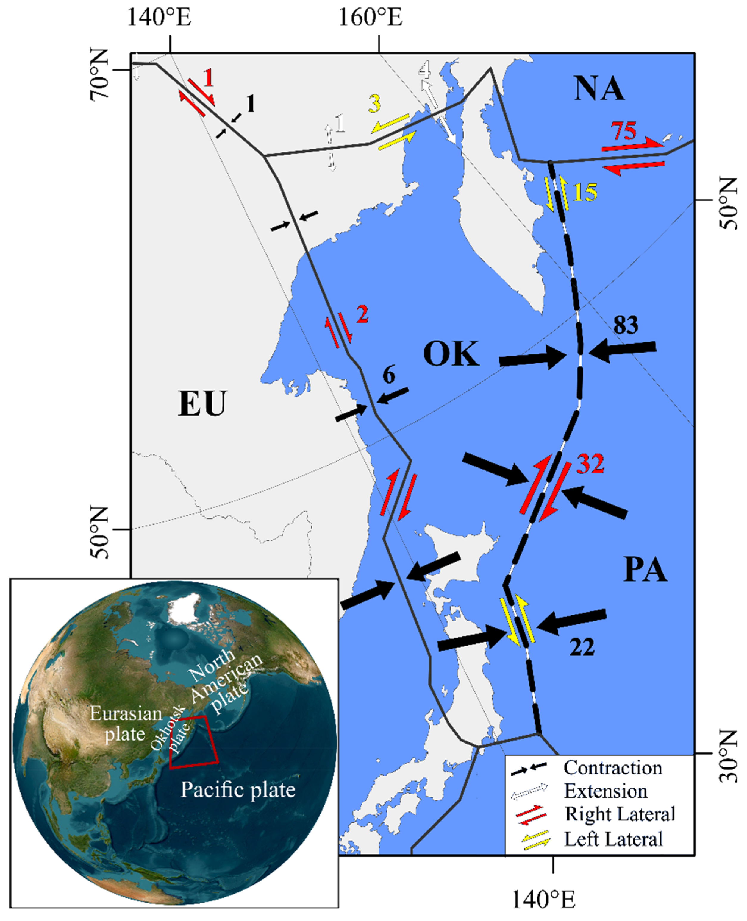 - Hindle, D.; Fujita, K.; Mackey, K. Deformation of the Northwestern Okhotsk Plate: How is it happening? Stephan Mueller Spec. Publ. Ser. 2009, 4, 147–156. [Google Scholar] [CrossRef]