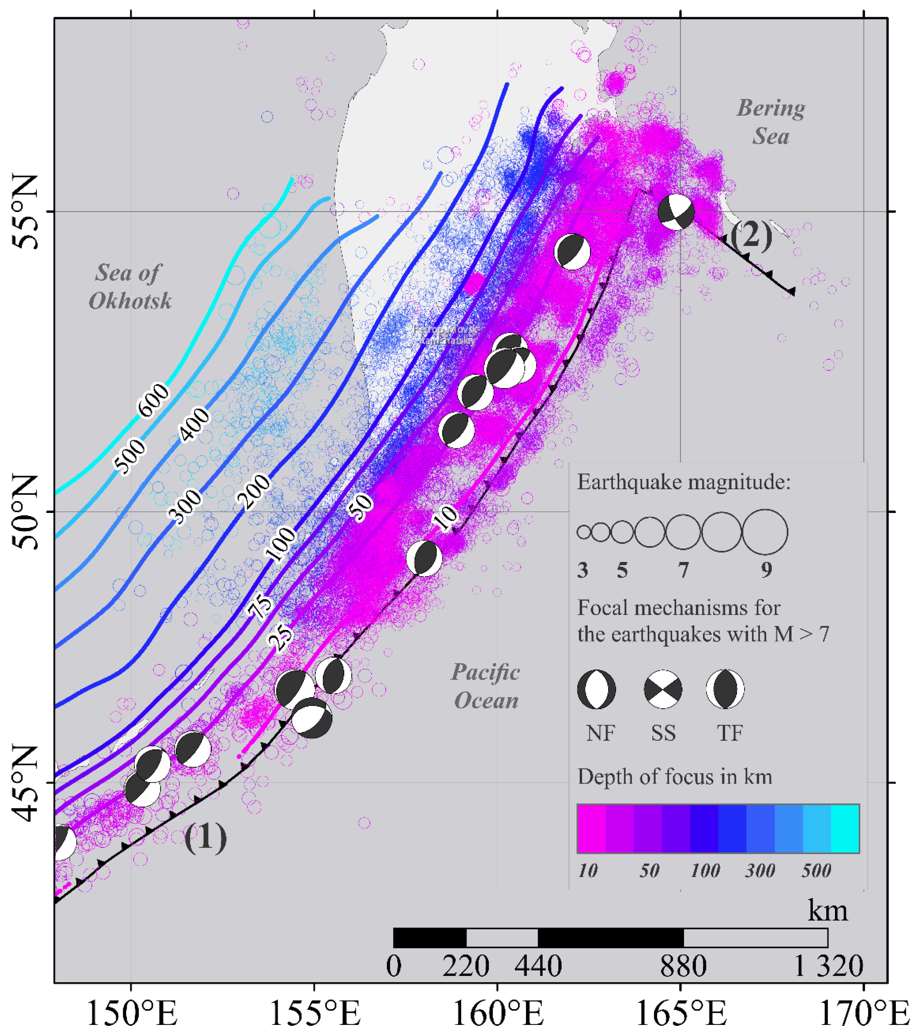- Bushenkova, N.; Kuchay, O.A. Focal mechanisms of earthquakes in the subduction zone of the Western Pacific plate. Geodyn. Tectonophys. 2022, 13, 0639. [Google Scholar] [CrossRef]