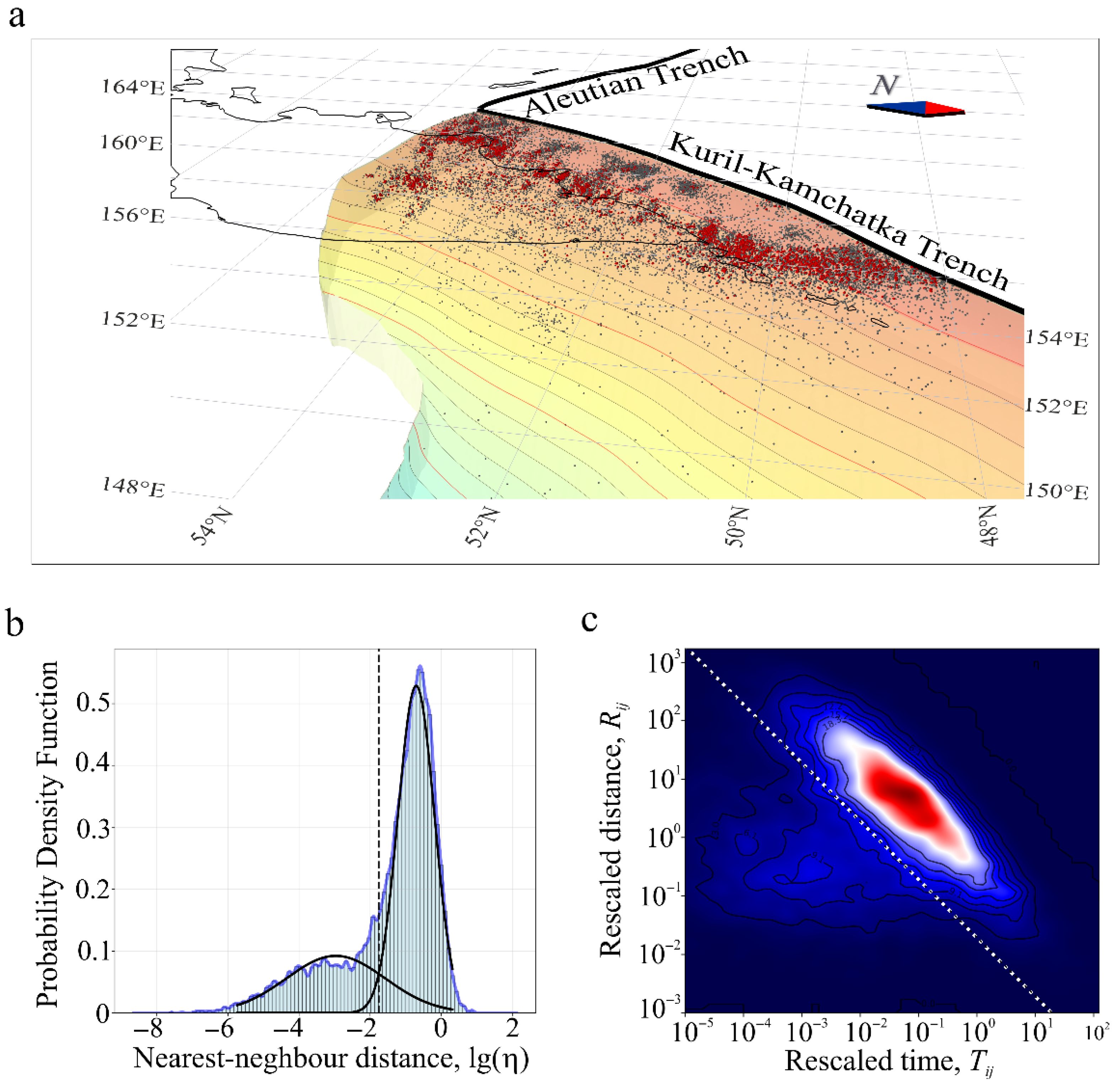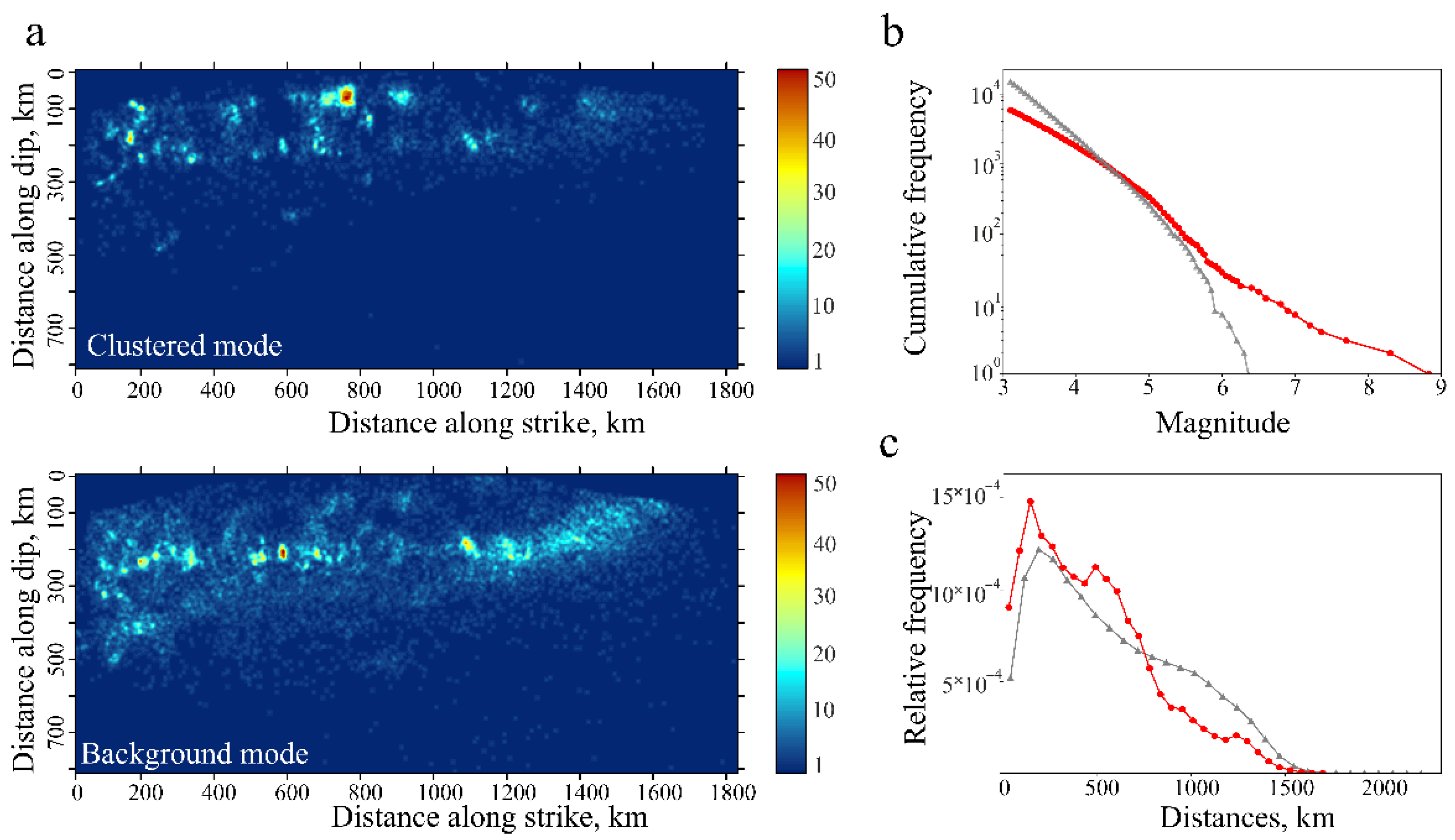 - If there are several configurations with identical numbers of dense clusters and events in the clusters, the optimal configuration is determined via the analysis of pairwise distances between events in dense clusters. Dense clusters localize in zones of tectonic asperity localization; hence, the characteristic distance between events, which form dense sets, should correspond to the maximum distribution of distance between all the background events (Figure 4c).