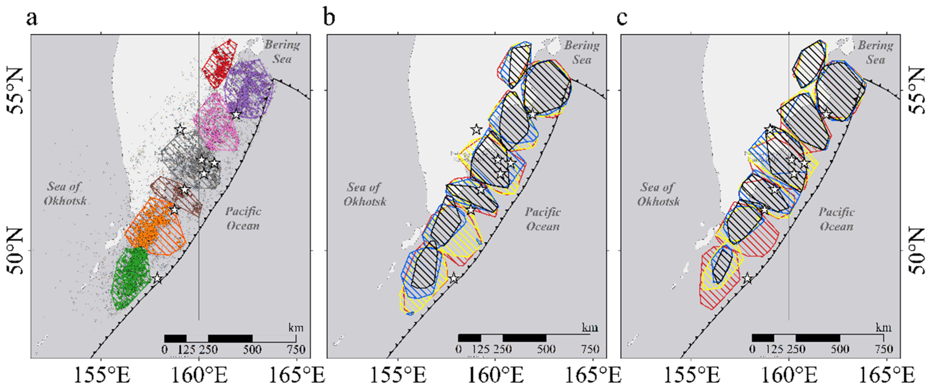 - Fedotov, S.A.; Solomatin, A.V.; Chernyshev, S.D. A Long-Term Earthquake Forecast for the Kuril–Kamchatka Arc for the Period from September 2010 to August 2015 and the Reliability of Previous Forecasts, as well as their Applications. J. Volcanol. Seismol. 2011, 5, 75–99. [Google Scholar] [CrossRef]