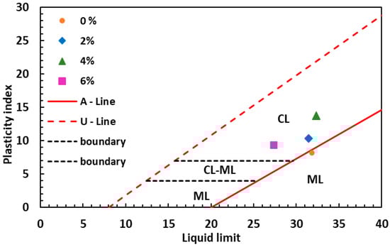 While both the plastic and liquid limits overall decreased with increased gravimetric lignin content, the plastic limit decreased at a slightly higher rate, thereby increasing the plasticity index and altering the soil classification from ML to CL, or clay of low plasticity, as shown in Figure 1.
