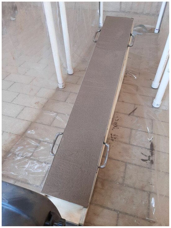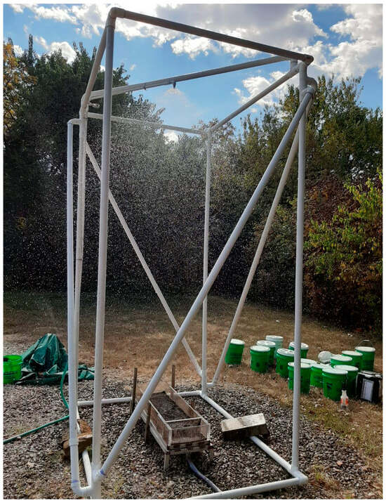 Rainfall erosion tests were conducted 6 h after the application of the lignin solution. The simulator consisted of a full-cone nozzle (50 WSQ, Spraying Systems Co., Wheaton, IL, USA) mounted on a PVC frame, positioned approximately 2.99 m above the soil surface (Figure 3). A regulated water pressure produced a uniform rainfall intensity of around 6.35 cm per hour over the soil surface. This setup replicates the configuration used in [21], where it was demonstrated that such a system closely mimics natural rainfall in terms of drop size, impact energy, intensity, and distribution. According to [22], a rainfall intensity of 6.35 cm per hour corresponds to a 10- to 25-year, one-hour storm event in various regions of Kansas. Each rainfall erosion test was conducted for a duration of one hour.