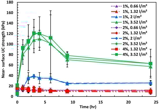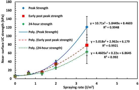 Figure 5 also shows that a spraying rate of 3.52 L/m2 consistently yields higher strengths, regardless of the lignin solution concentration. For example, there is no difference between the peak and 24 h strengths of soils sprayed with 2% and 4% lignin concentrations at a spraying rate of 3.52 L/m2. Thus, the spraying rate has a more pronounced effect on the UCS than the solution concentration. A similar finding, i.e., that lignin concentration does not significantly affect cohesive strength, was mentioned in the introductory section [14]. Based on these findings, near-surface strength data are grouped by spraying rates and shown in Figure 6. This provides a sufficient number of data points for fitting a quadratic curve, which shows a quadratic growth of near-surface strength with the spraying rate.